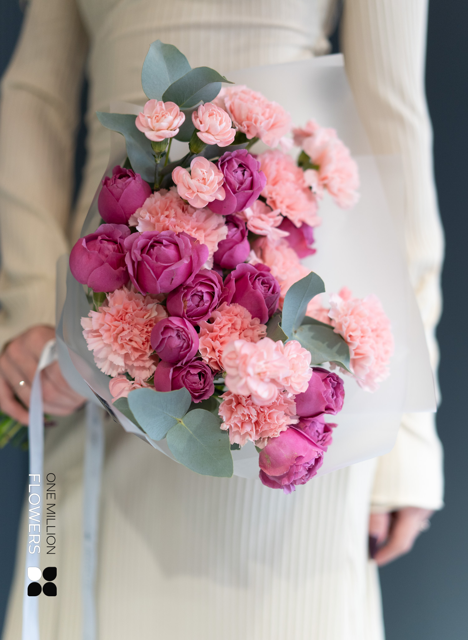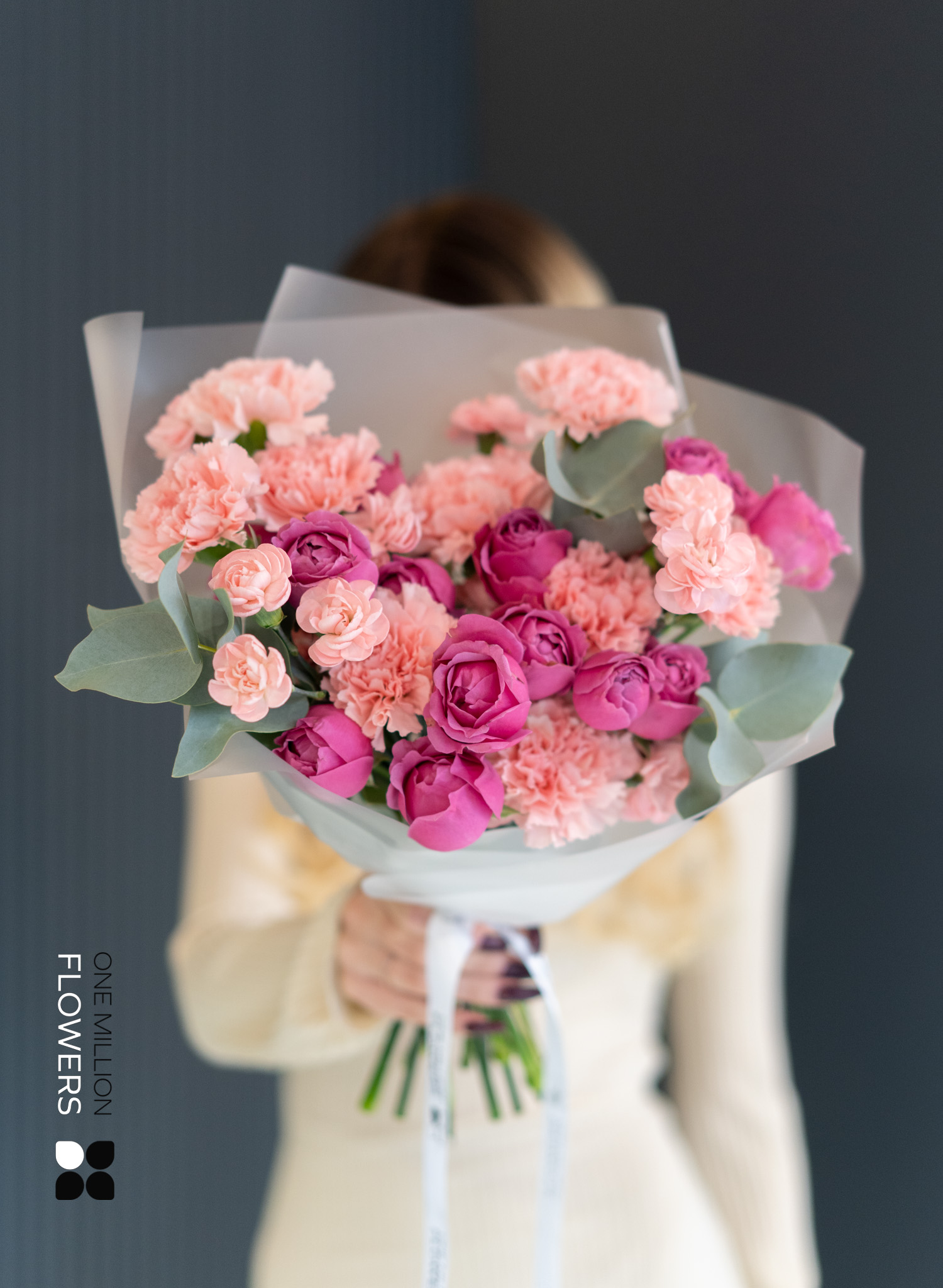 Букет "Блаш Рози" — это воздушная композиция, созданная для того, чтобы говорить без слов. В его составе — кустовые розы пастельно-розового оттенка, кремовые гвоздики и пушистая маттиола, дополненные эвкалиптом и акцентной зеленью. Этот букет будто соткан из утреннего румянца и мягкого света — не яркий, но чарующе красивый.