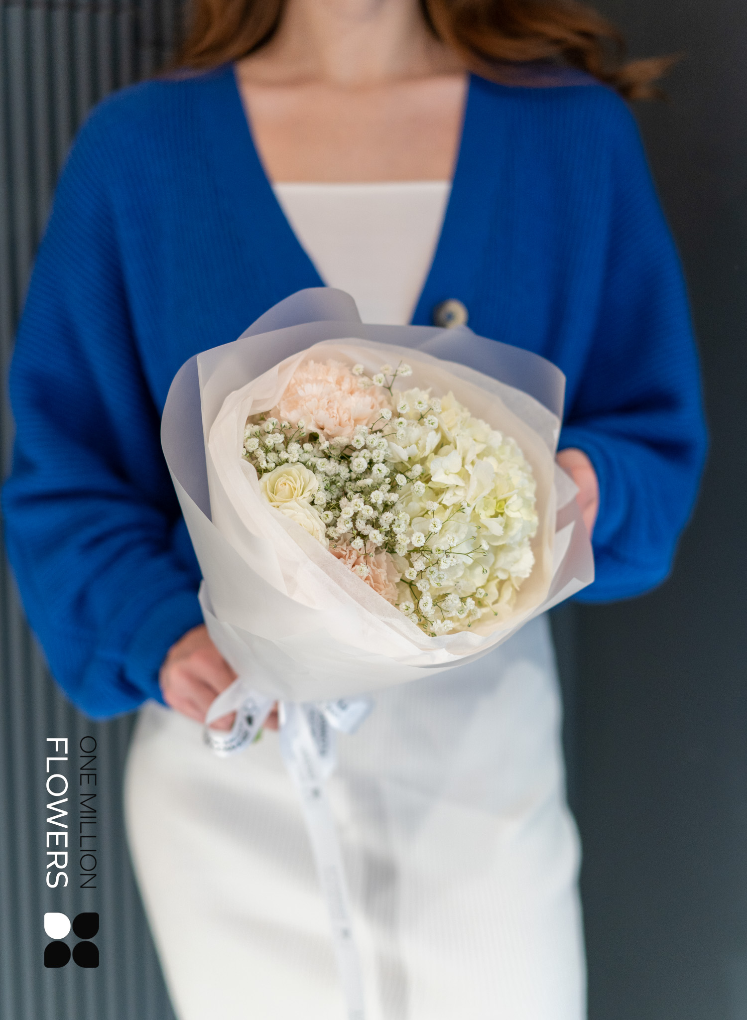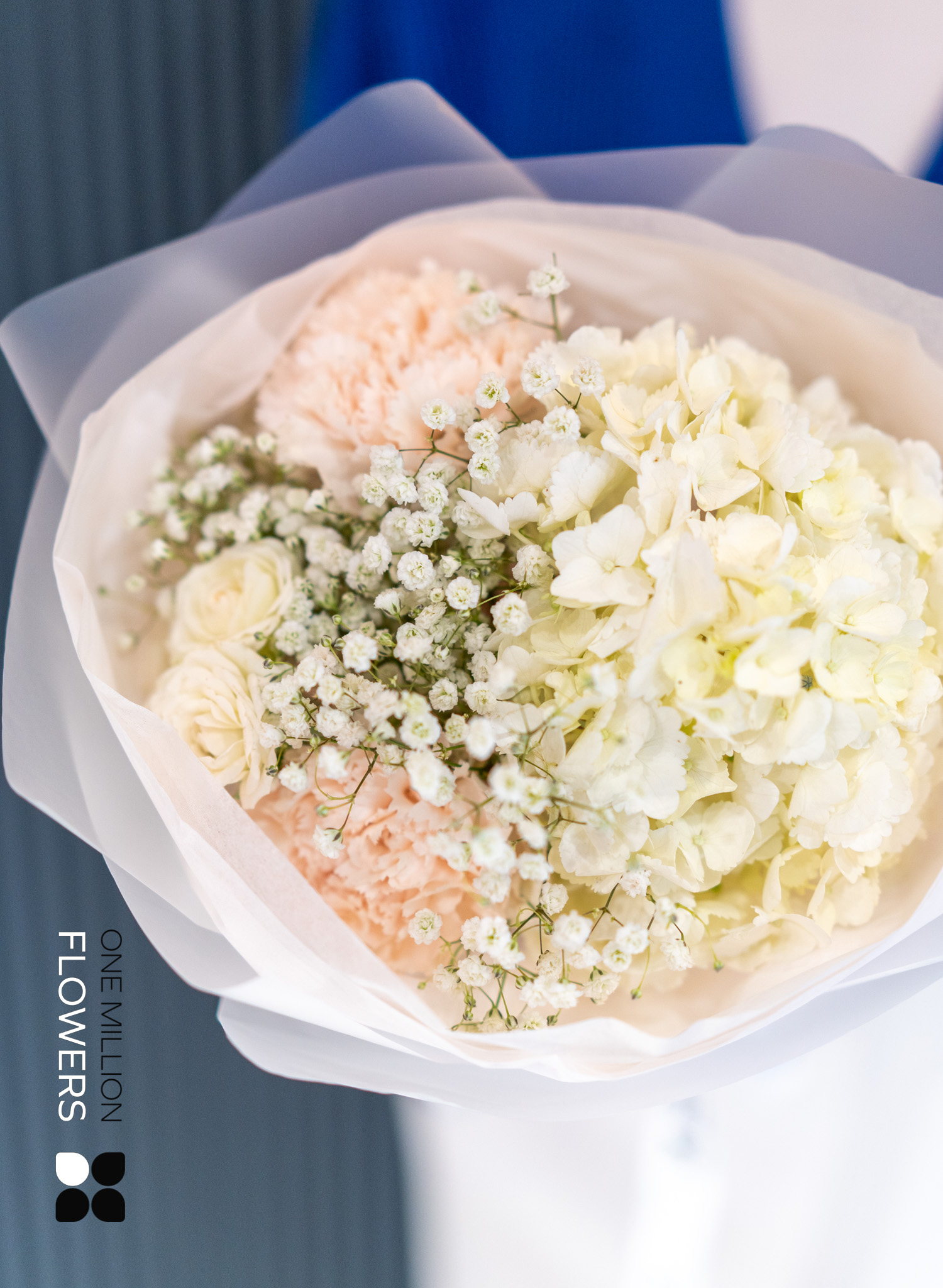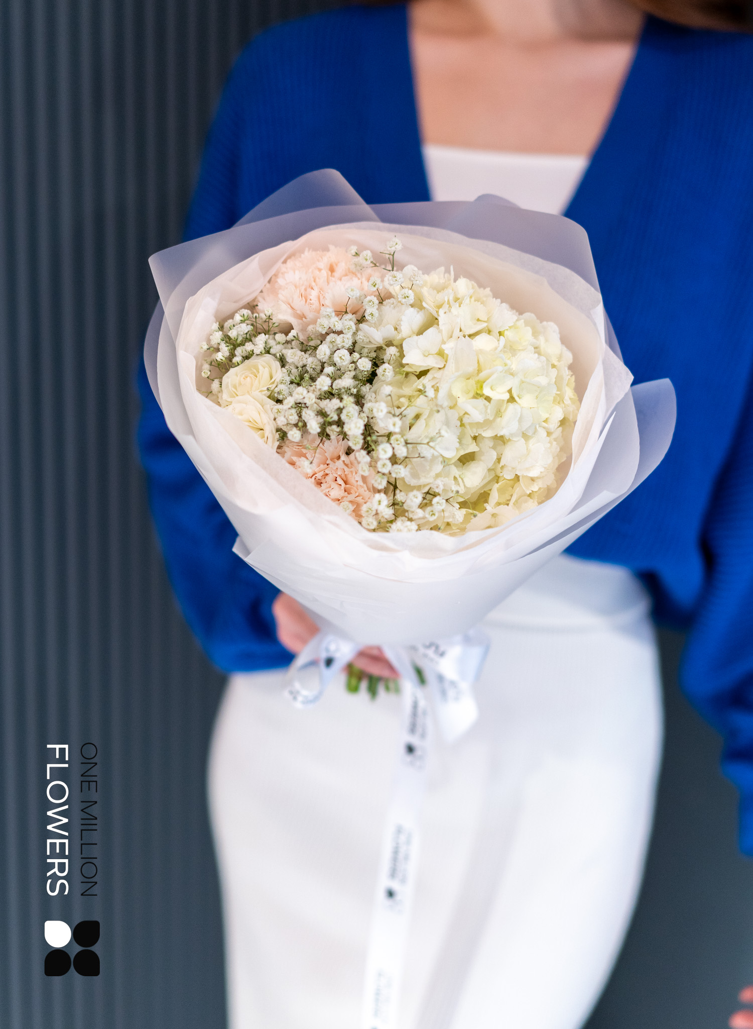 Букет "Диa Брют" Mate пленит своей свежестью. Кремовые диантусы добавляют мягкости, а белая роза Сноуфлейк символизирует чистоту и искренность чувств. Гортензия, с её роскошными соцветиями, подчеркнёт индивидуальность и стиль, привнося в атмосферу нотки романтики и элегантности. Гипсофила, известная своей воздушностью, добавляет легкость и очарование, становясь идеальным акцентом в композиции.
