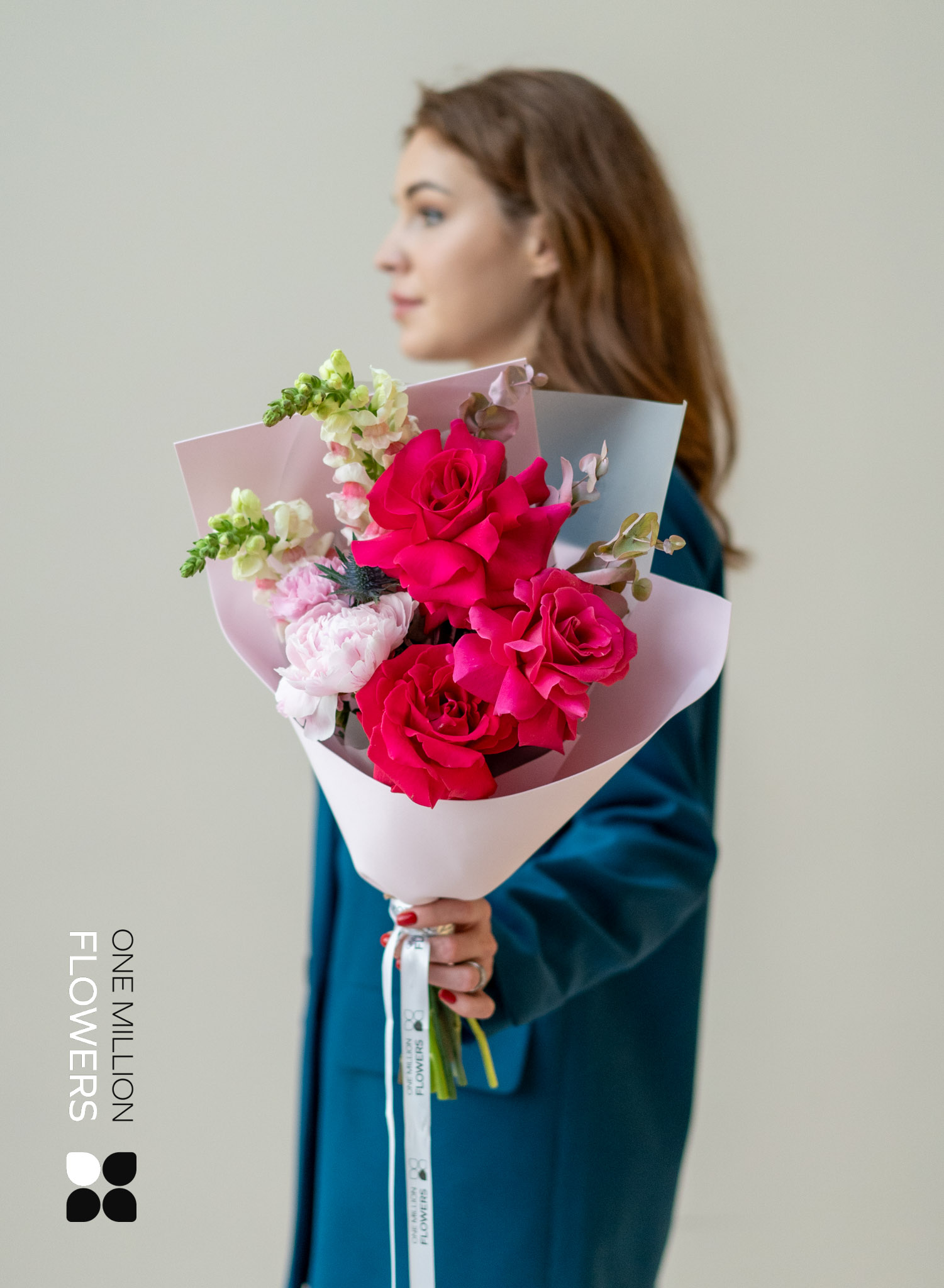 Букет "Флойд Х Сара" — это нежная композиция, в которую входят три розы розового цвета из Эквадора "Пинк Флойд", один пион розового оттенка, две гвоздики (диантус) и один эвкалипт. Также в букете вы найдёте два антиррина и один эрингиум, которые добавляют текстуры и интересной зелени, создавая яркую и живую картину.
