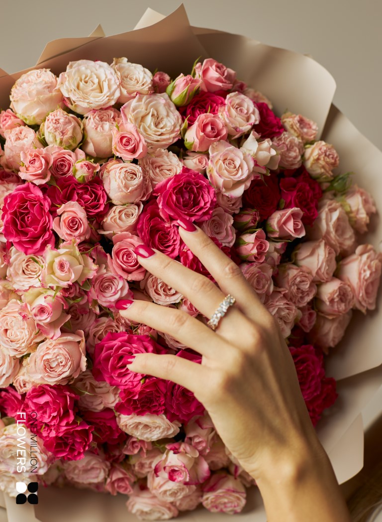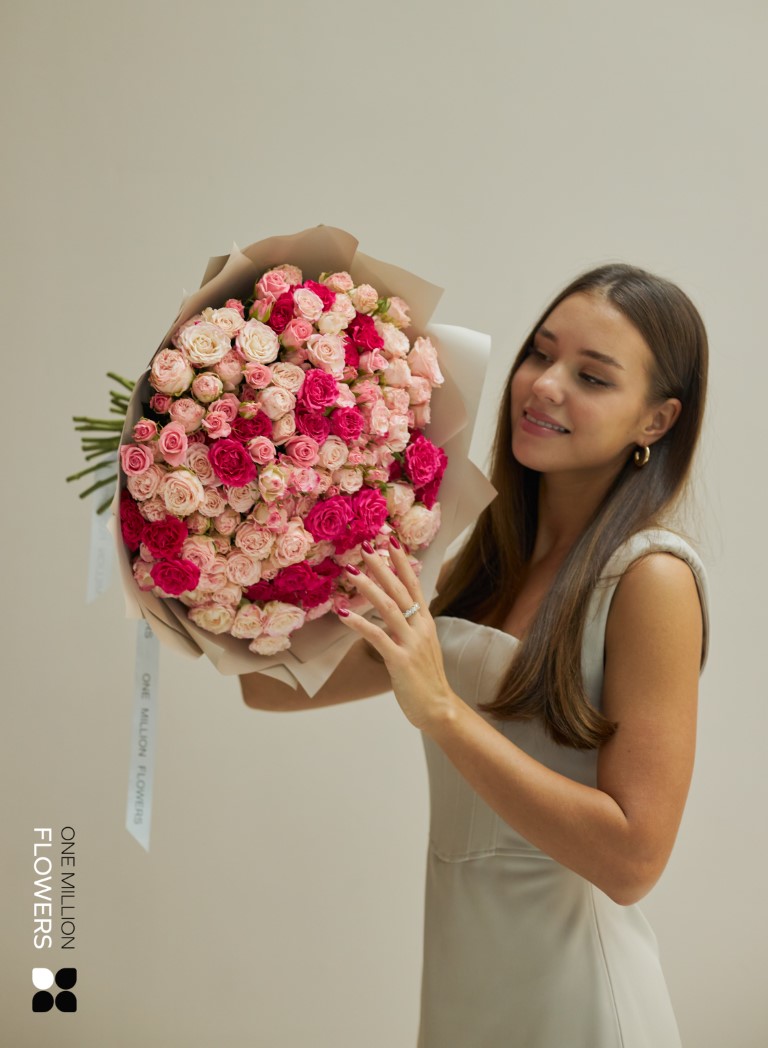 Букет состоит из 51 кустовой розы, каждая из которых привносит в композицию свою уникальность и изящество. В состав входят: - Роза кустовая Рефлекс (кремовая) — 11 шт. - Роза кустовая Натали (розовая) — 15 шт. - Роза кустовая Лианна (малиновая) — 11 шт. - Роза кустовая Бомбастик Кремовый (нежно) — 14 шт.