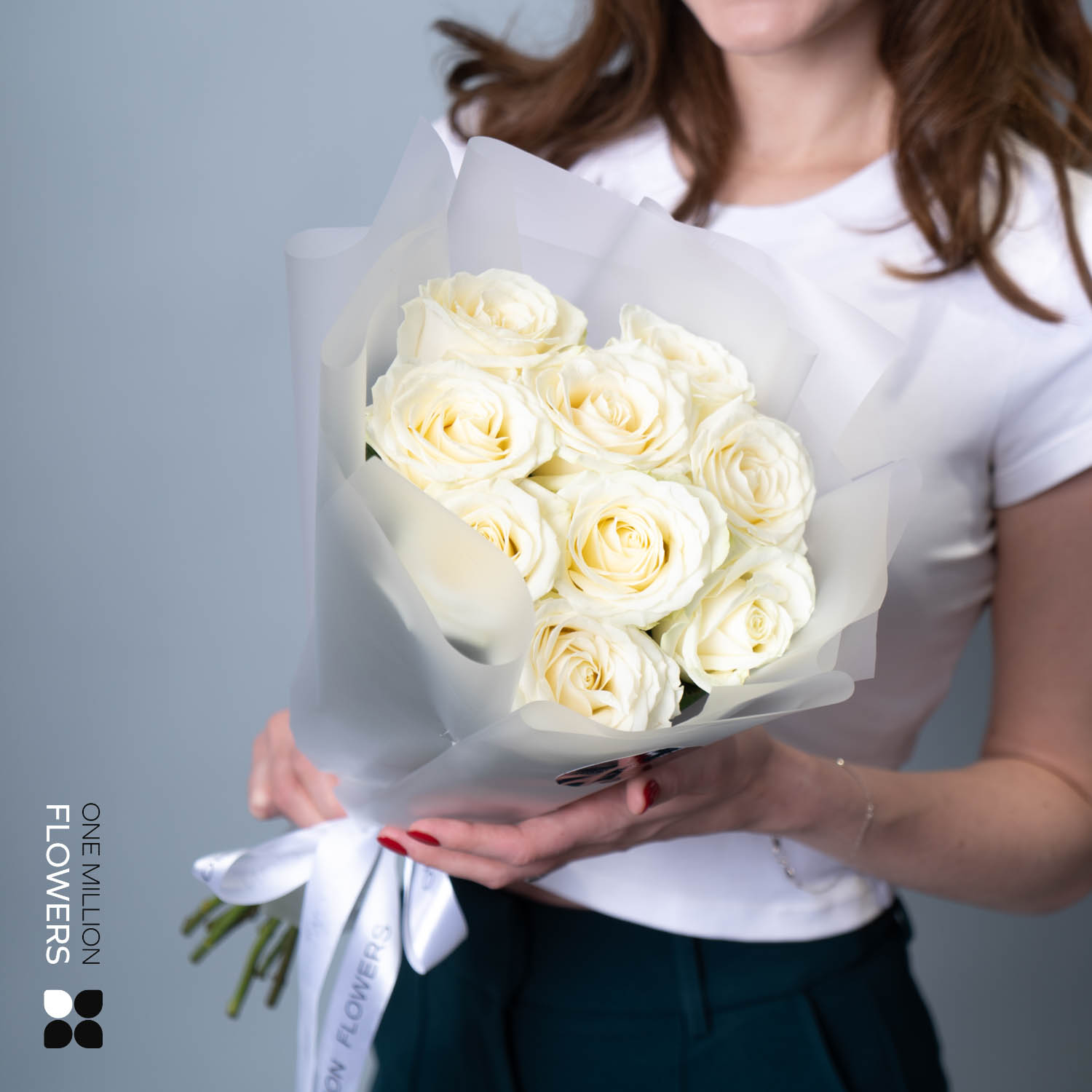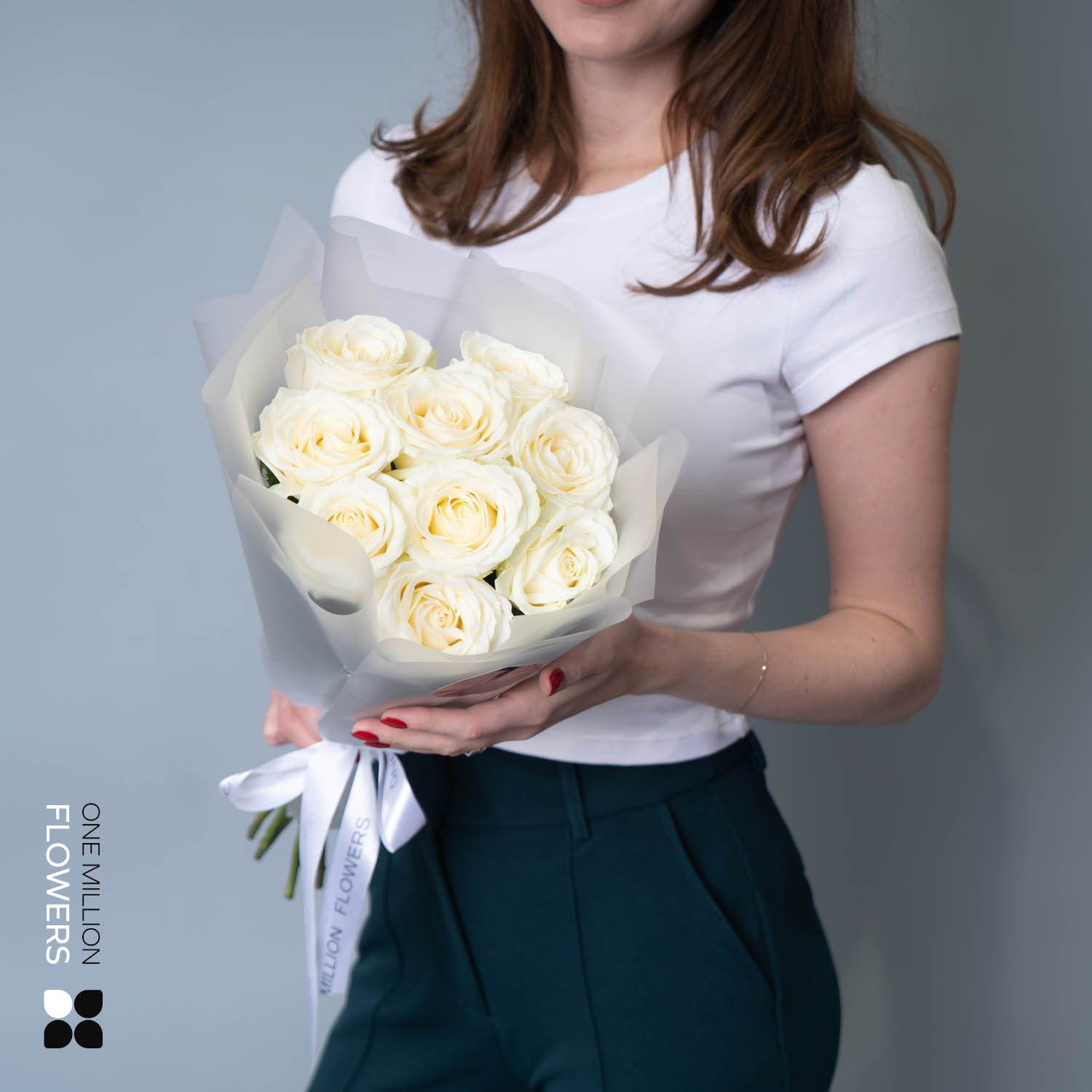 Букет из 9 "Аваланш" Mate - Высотой 40 см. включает в себя 9 прекрасных белоснежных роз аваланш, высотой 40 см каждая.