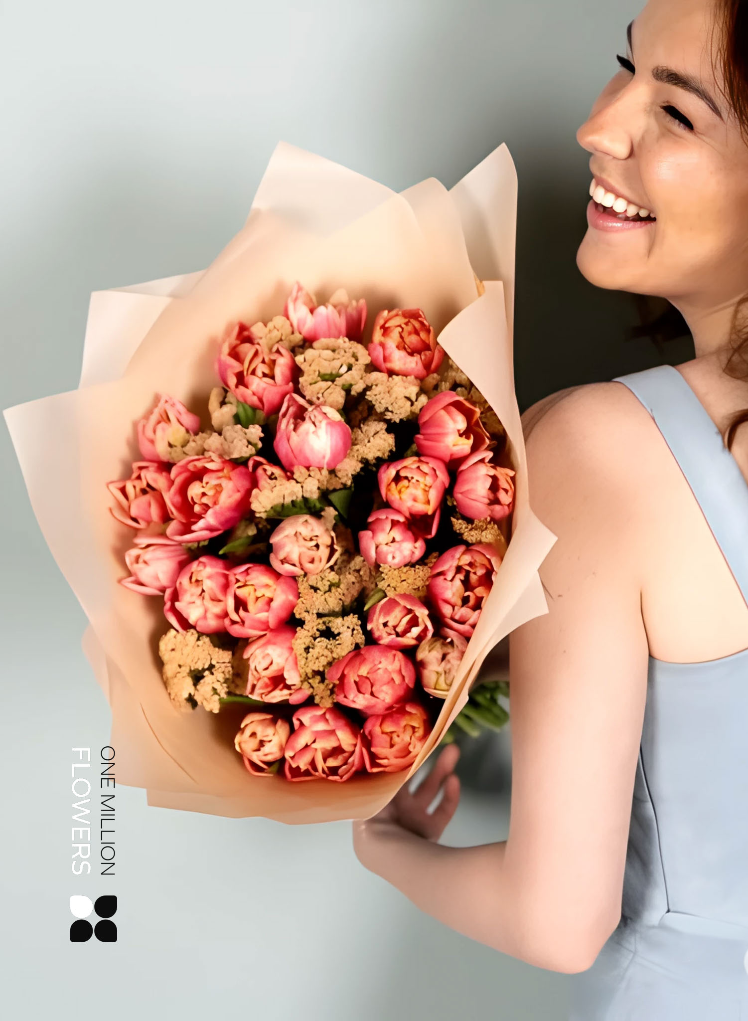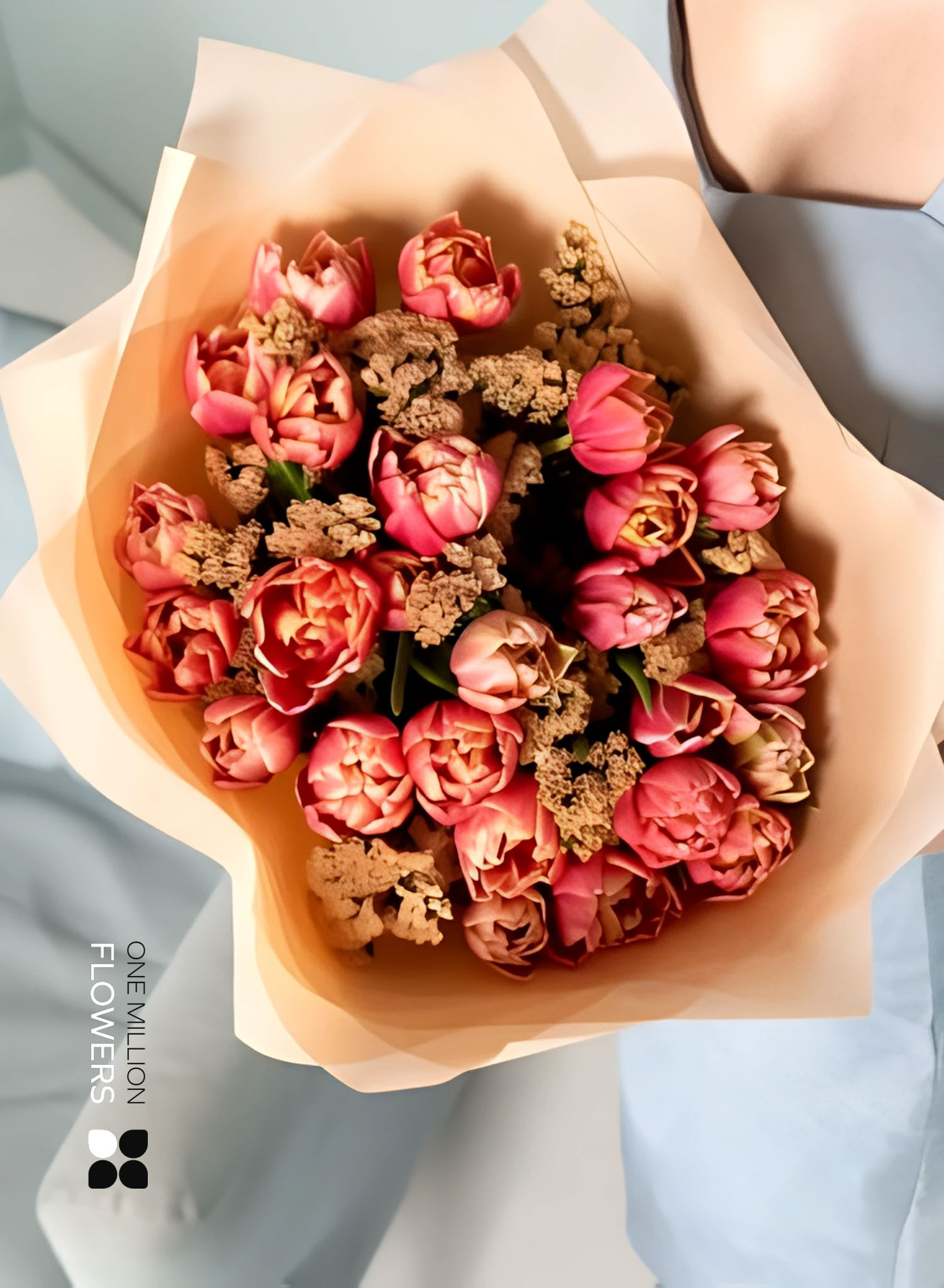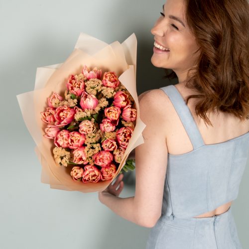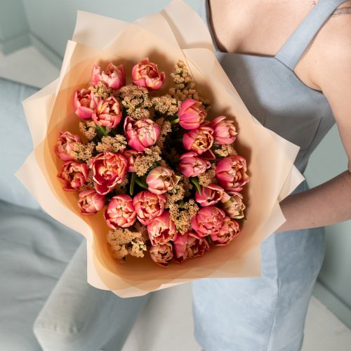 Букет "Крим Коламбус" Pink — это гармоничное сочетание нежности и элегантности. В его составе 23 пионовидных тюльпана розового цвета, которые напоминают о весеннем пробуждении природы. Каждый из этих тюльпанов словно наполнен нежным светом и теплом, приносящими радость и вдохновение. Добавление 5 веточек статицы делает букет особенно привлекательным, подчеркнув его утончённость.