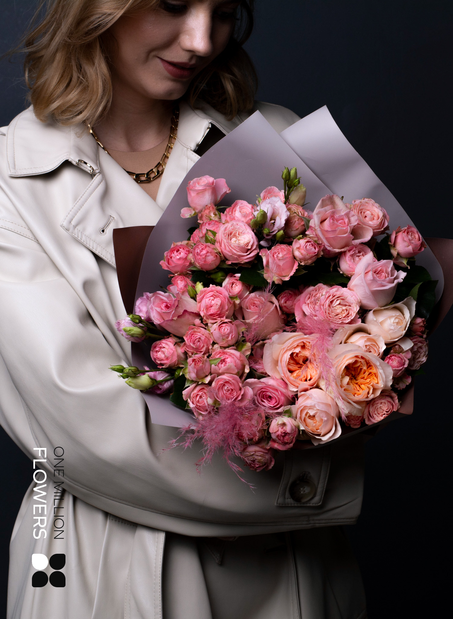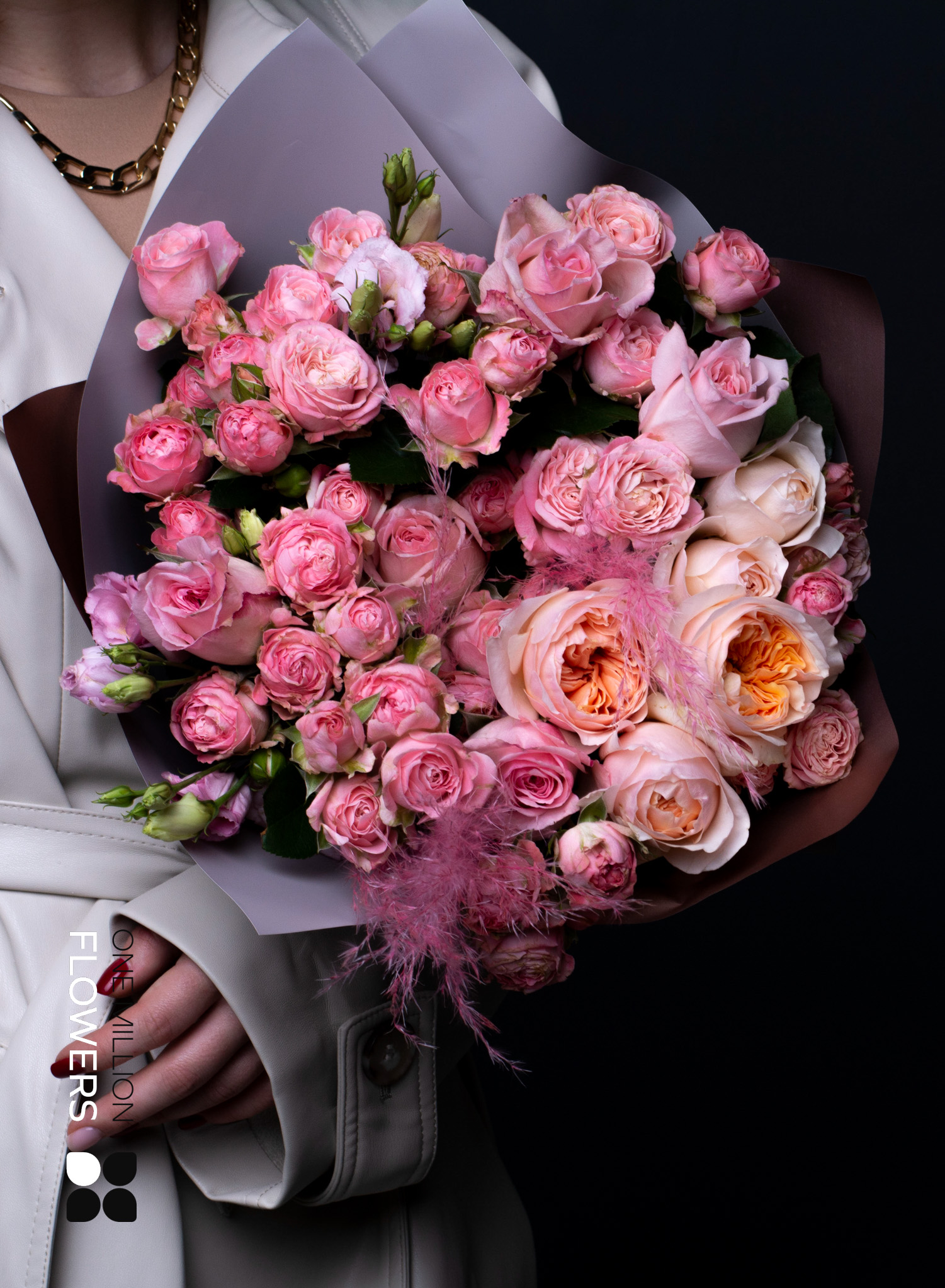 Букет "Лайт-Маро" Grey — это стильный парад цветов, который включает в себя 7 кустовых роз Бомбастик Кремовый (нежно), 3 пионовидные розы Девид Остин Джульетта, 3 пионовидные розы Пинк Охара, 5 кустовых роз Бомбастик Малиновый, 5 диантусов розовых (гвоздик), 4 эустомы розовые и 2 сухоцвета Кортадерия. Такой букет не просто набор цветов, а настоящая симфония, способная наполнить любой дом атмосферой уюта и красоты. Каждое цветение — это история, каждый оттенок — эмоция, и в этом букете они прекрасно переплетаются. Розы, например, символизируют страсть и любовь, а эустомы — нежность и грацию.