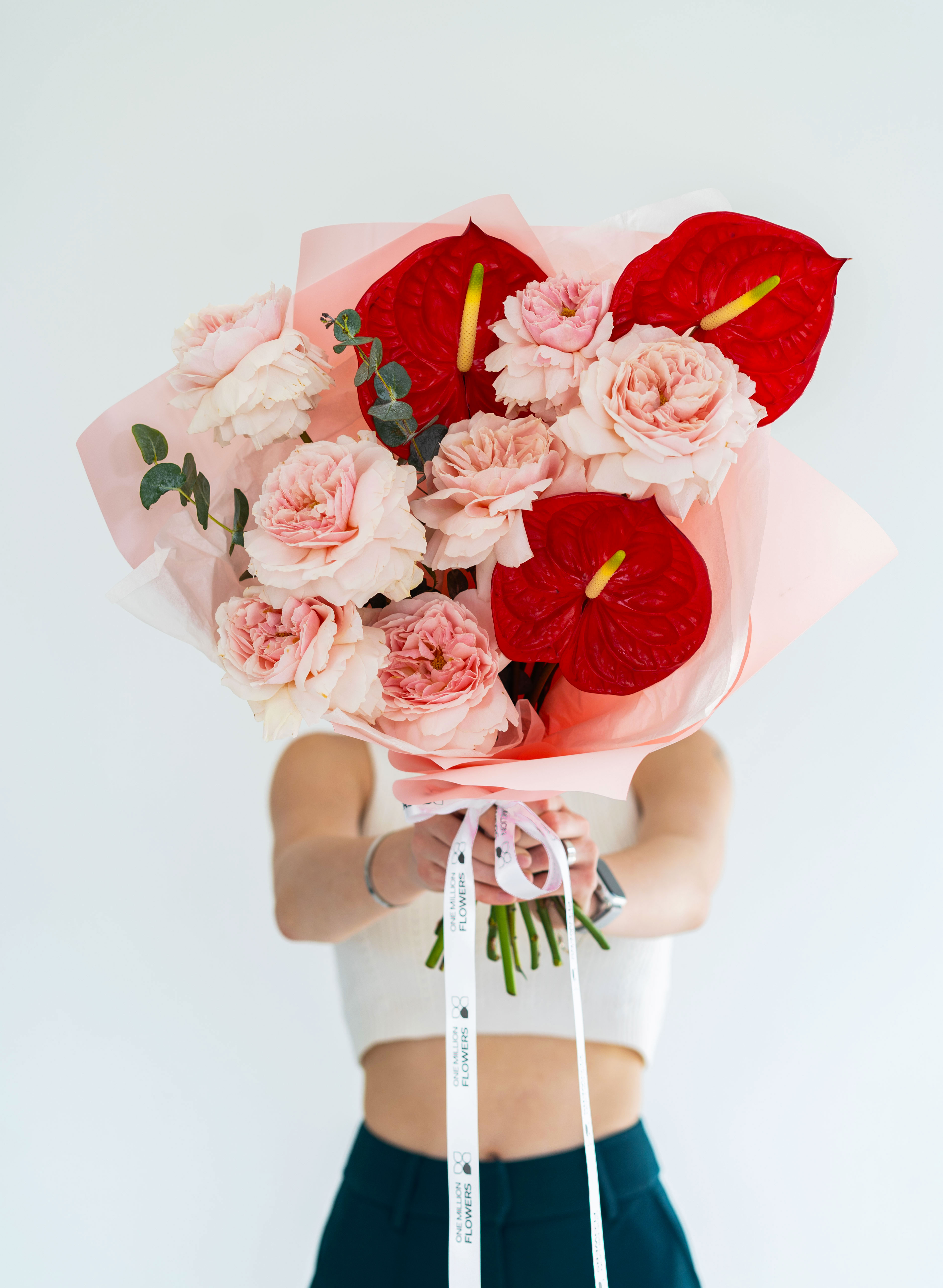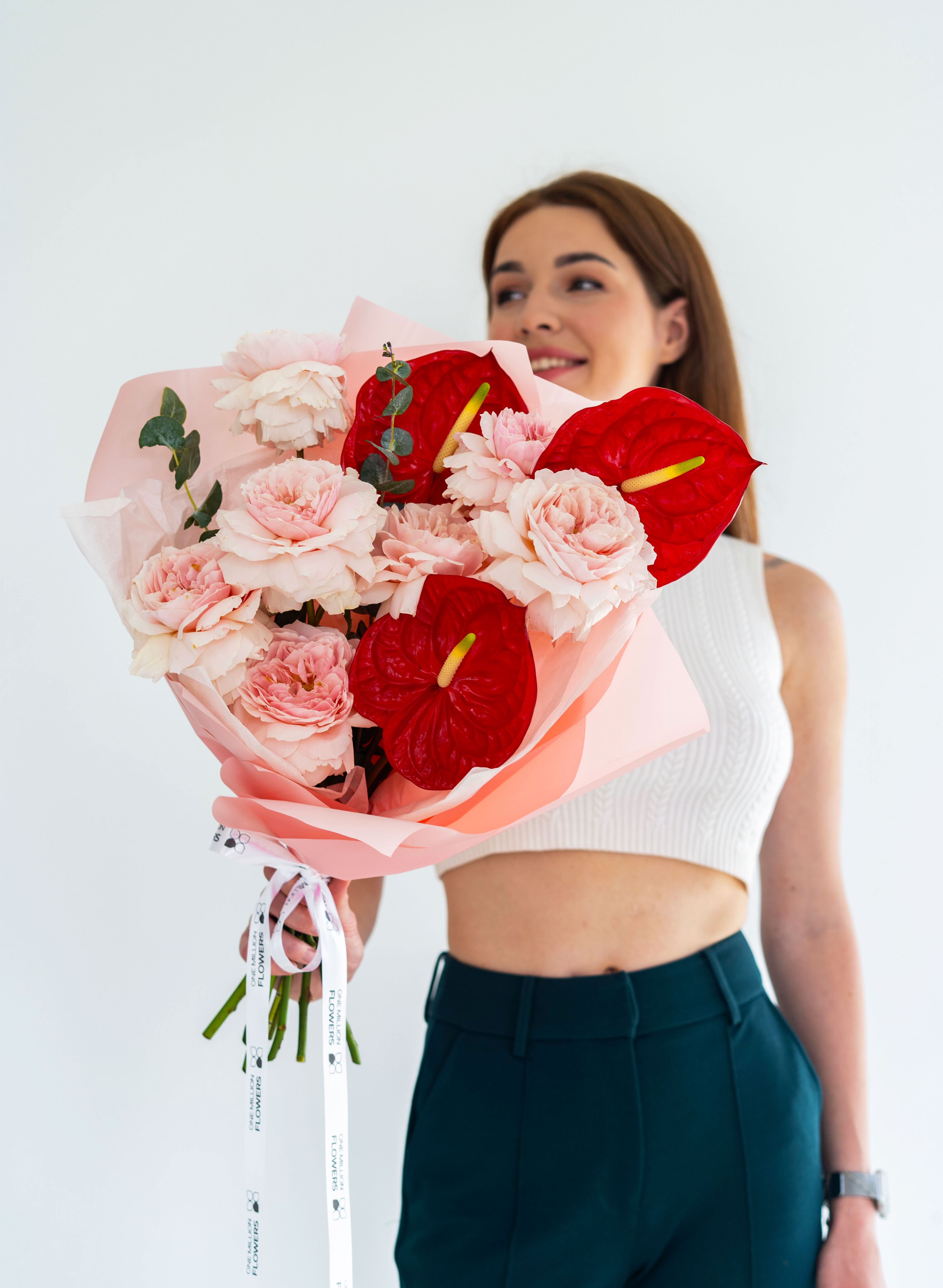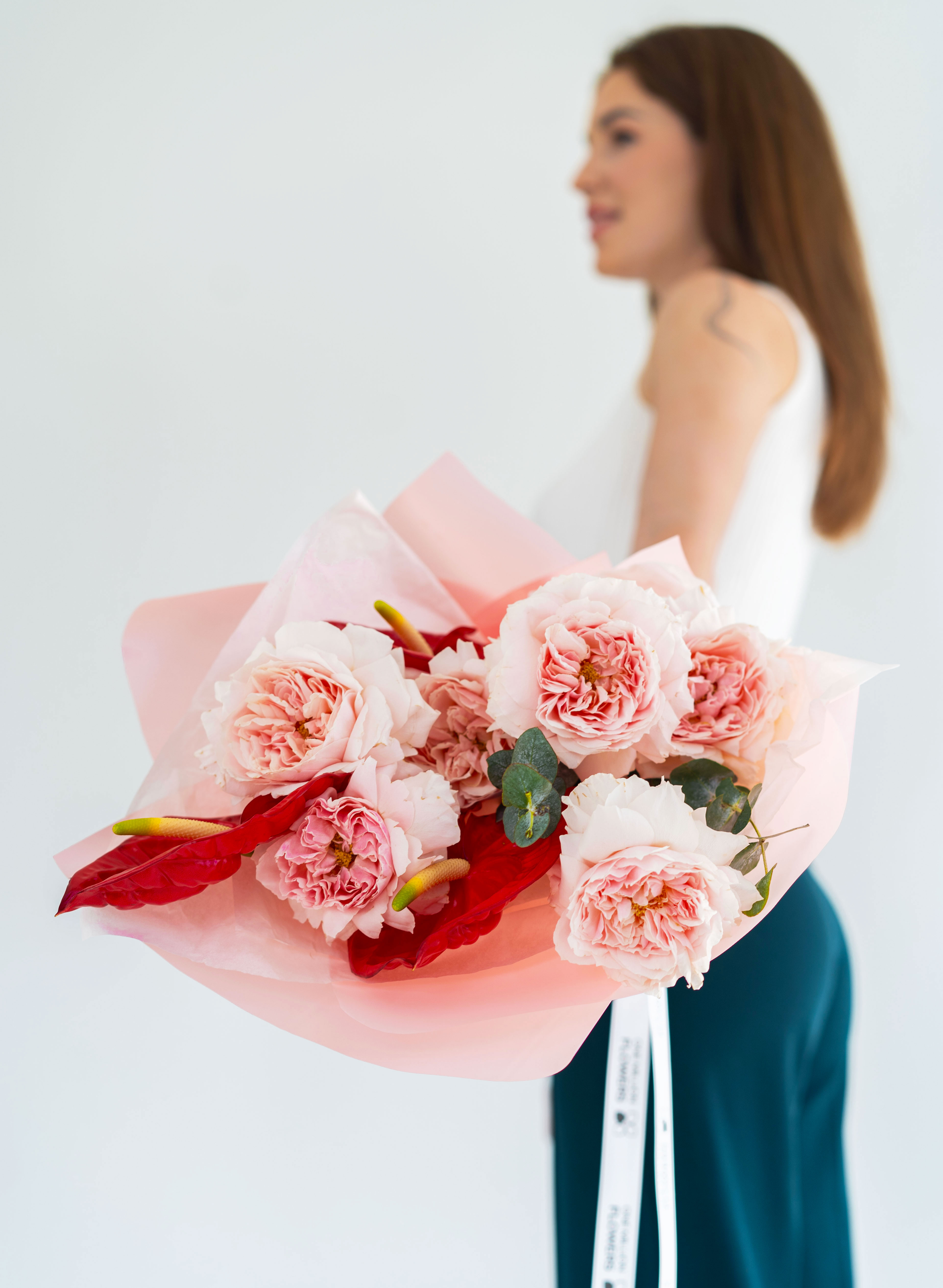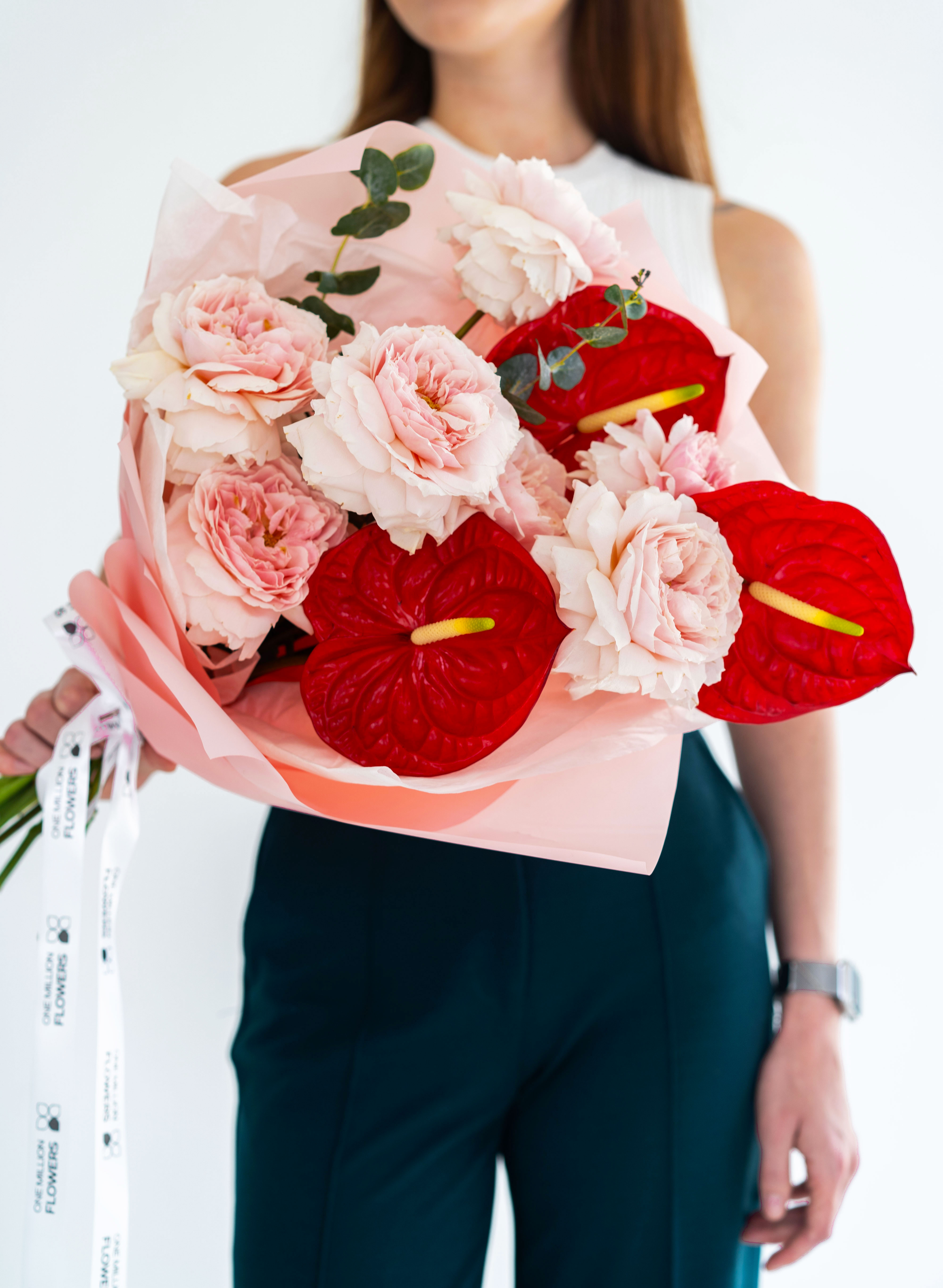 Изысканное сочетание цветов – мягкие розовые оттенки пионовидных роз гармонично сочетаются с экзотическими антуриумами.