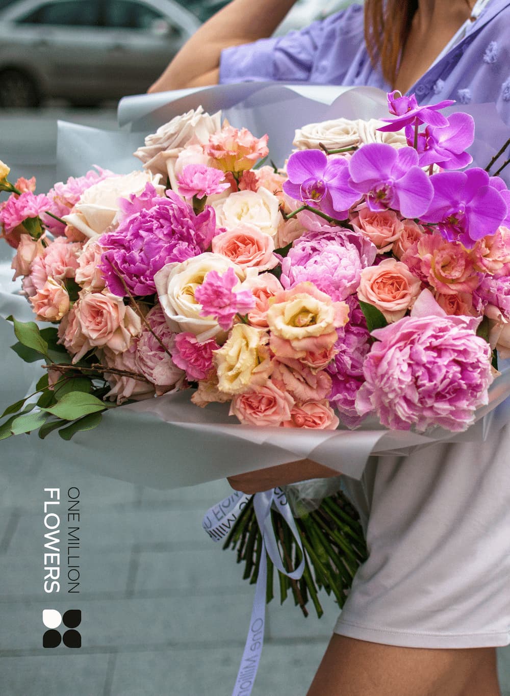В составе букета "Мизуно ист" вы найдете: - Пионовидная роза Мента — 7 шт. - Пион Розовый — 10 шт. - Пионовидная роза Вайт Охара — 3 шт. - Диантус розовый (Гвоздика) — 11 шт. - Пионовидная роза Пинк Охара — 8 шт. - Эвкалипт — 2 шт. - Роза кустовая Салинеро (кремовая) — 10 шт. - Фаленопсис люкс 1 ст — 1 шт. - Эустома Персиковая — 7 шт.