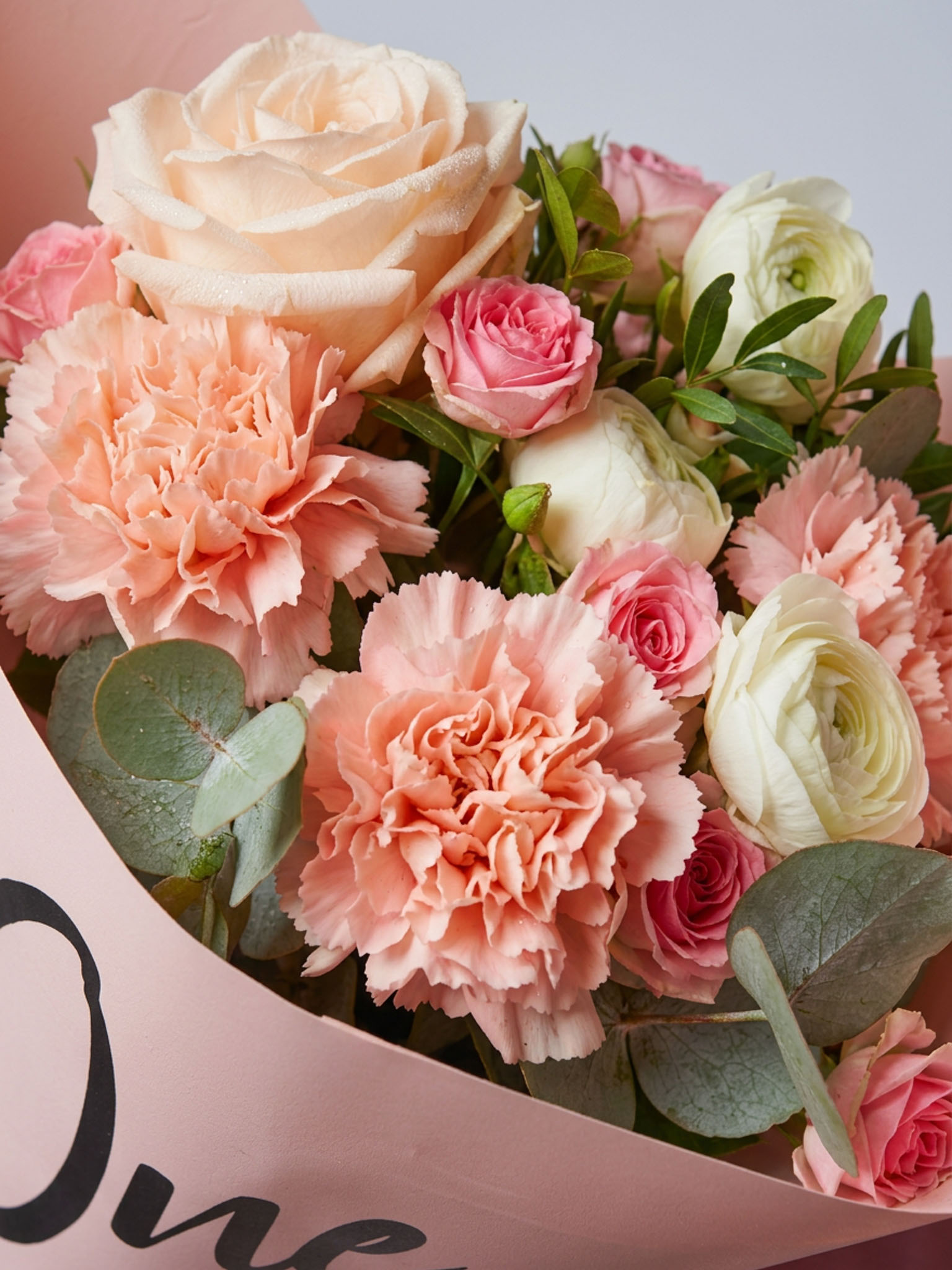 - Роза кустовая Мими Эден — 3 шт. - Диантус розовый (гвоздика) — 3 шт. - Ранункулюс белый — 3 шт. - Пионовидная роза Пинк Охара — 1 шт. - Эвкалипт — 1 шт.