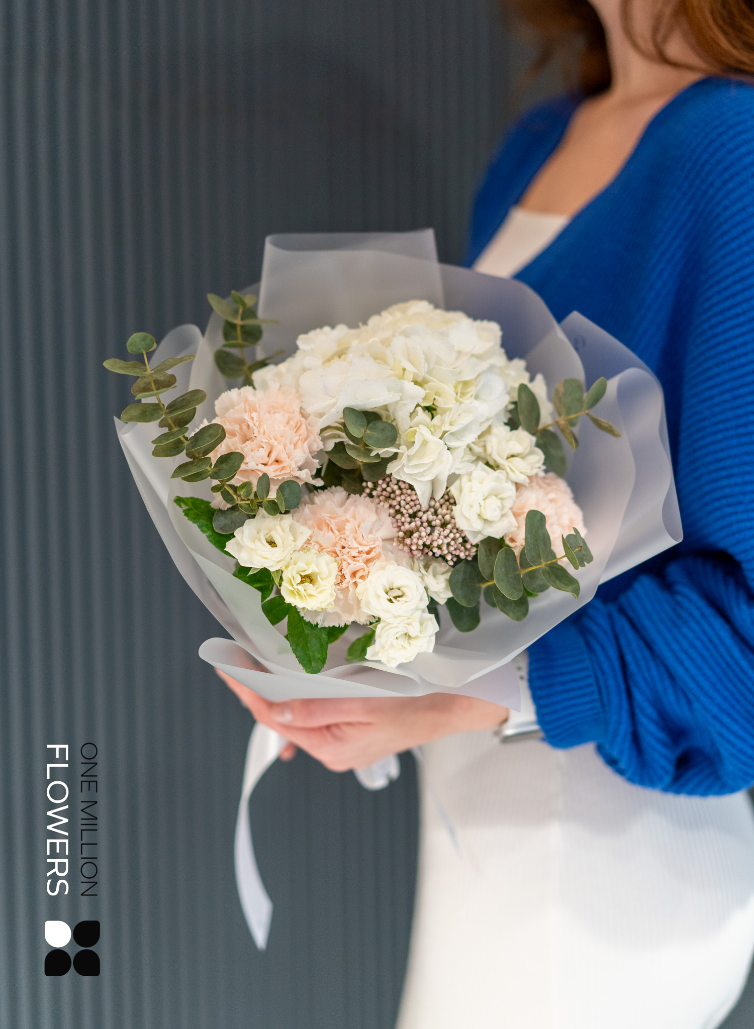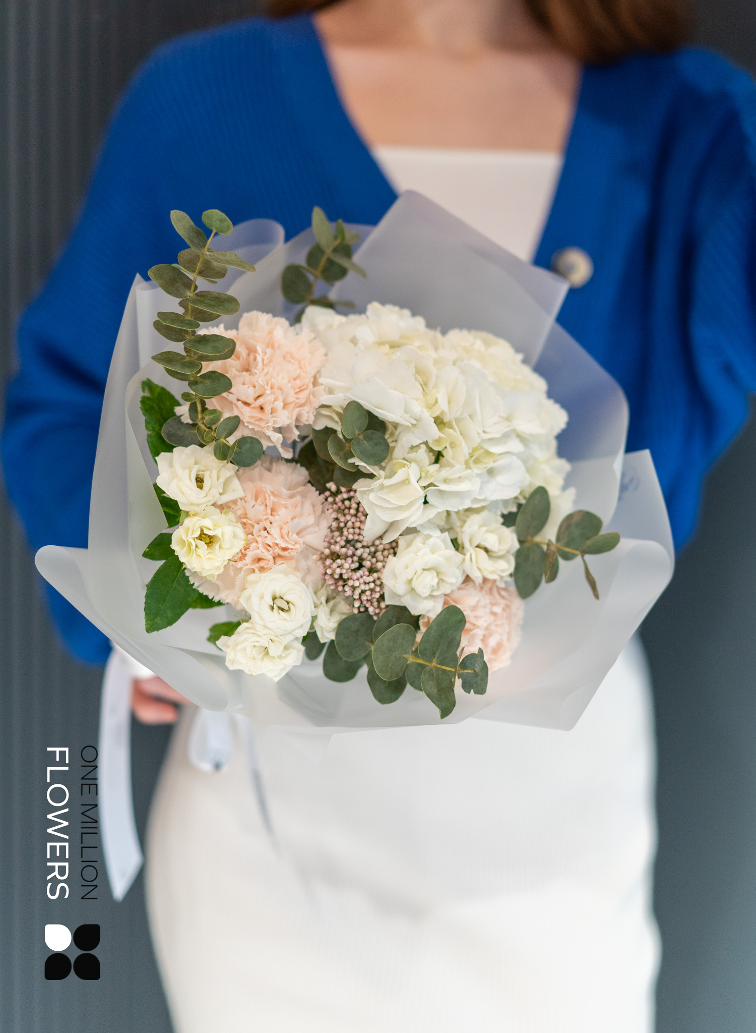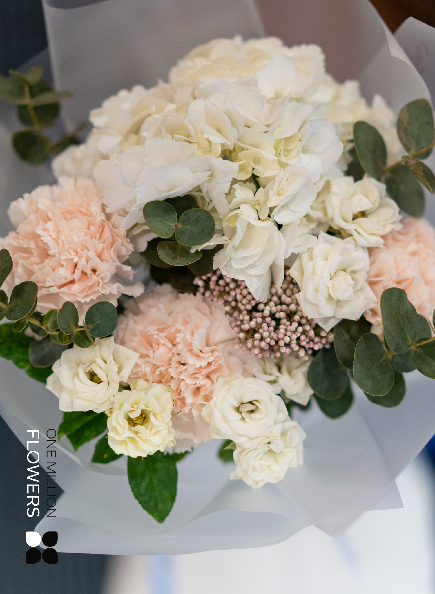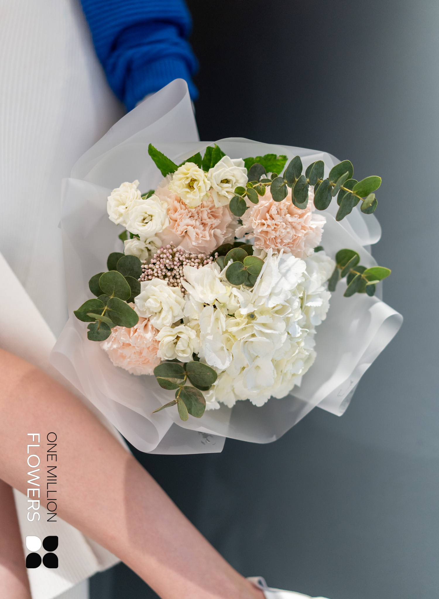 Букет "Сноу Креман" Mate — это великолепное сочетание нежности и элегантности. В его состав входят 3 кремовых диантуса (гвоздики), 1 ветка эвкалипта, 3 белые кустовые розы Сноуфлейк, 1 озатамнус и 1 белая гортензия. Благодаря такому разнообразию текстур и оттенков, букет выглядит утончённо и привлекательно, идеально подходя для любого особого случая.