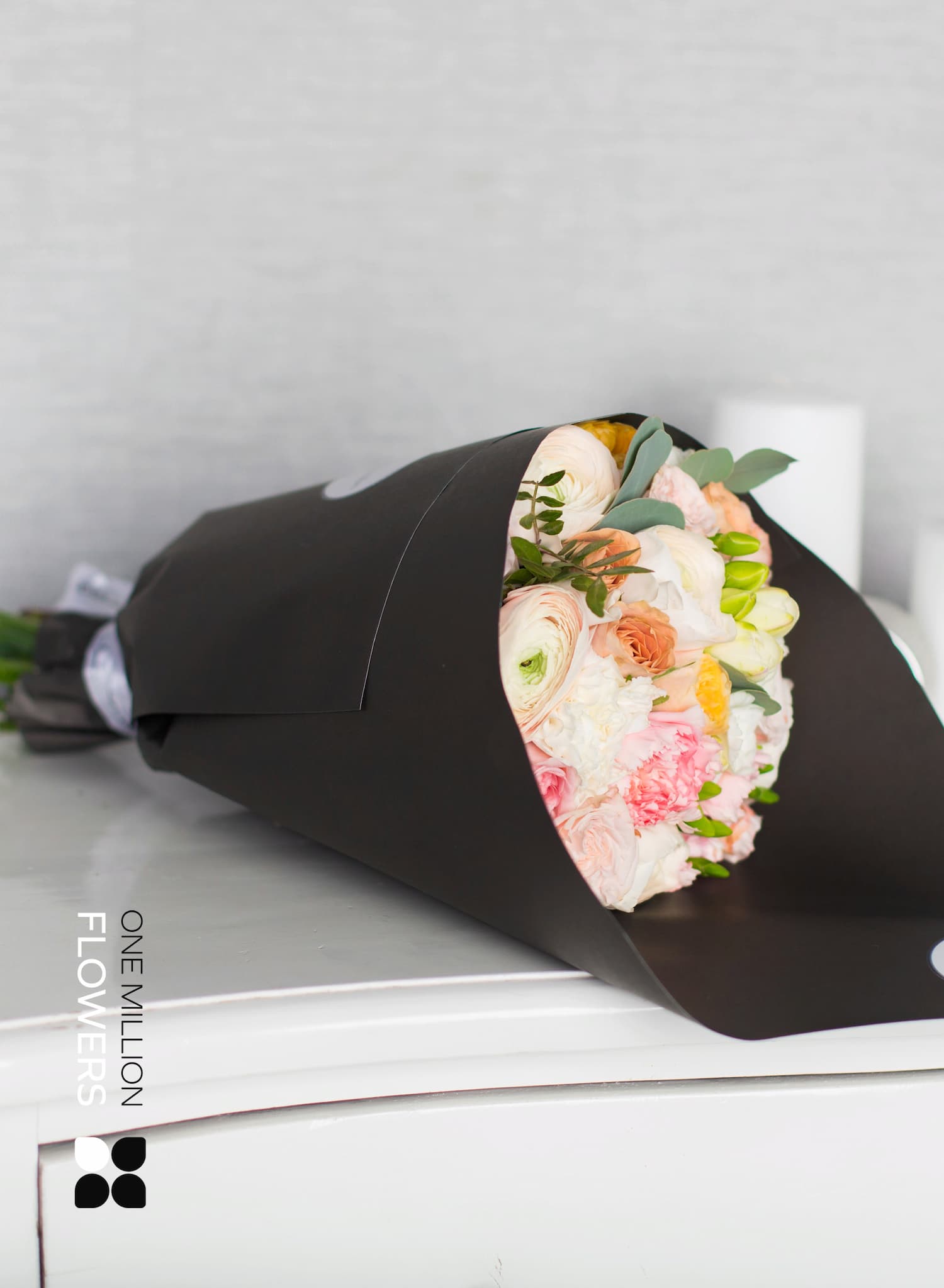 Букет "Пармеджано" Black — это изысканная композиция, гармония различных оттенков и текстур. В состав букета входят 4 пионавидные розы Вайт Охара, 6 белых фрезий, 4 розовых диантуса (гвоздики), 4 белых ранункулюса, 7 роз Капучино и 8 кустовых роз Бомбастик Кремовых. Уникальные акценты создают 2 веточки эвкалипта и 2 писташей, придавая букете свежесть и утонченность.