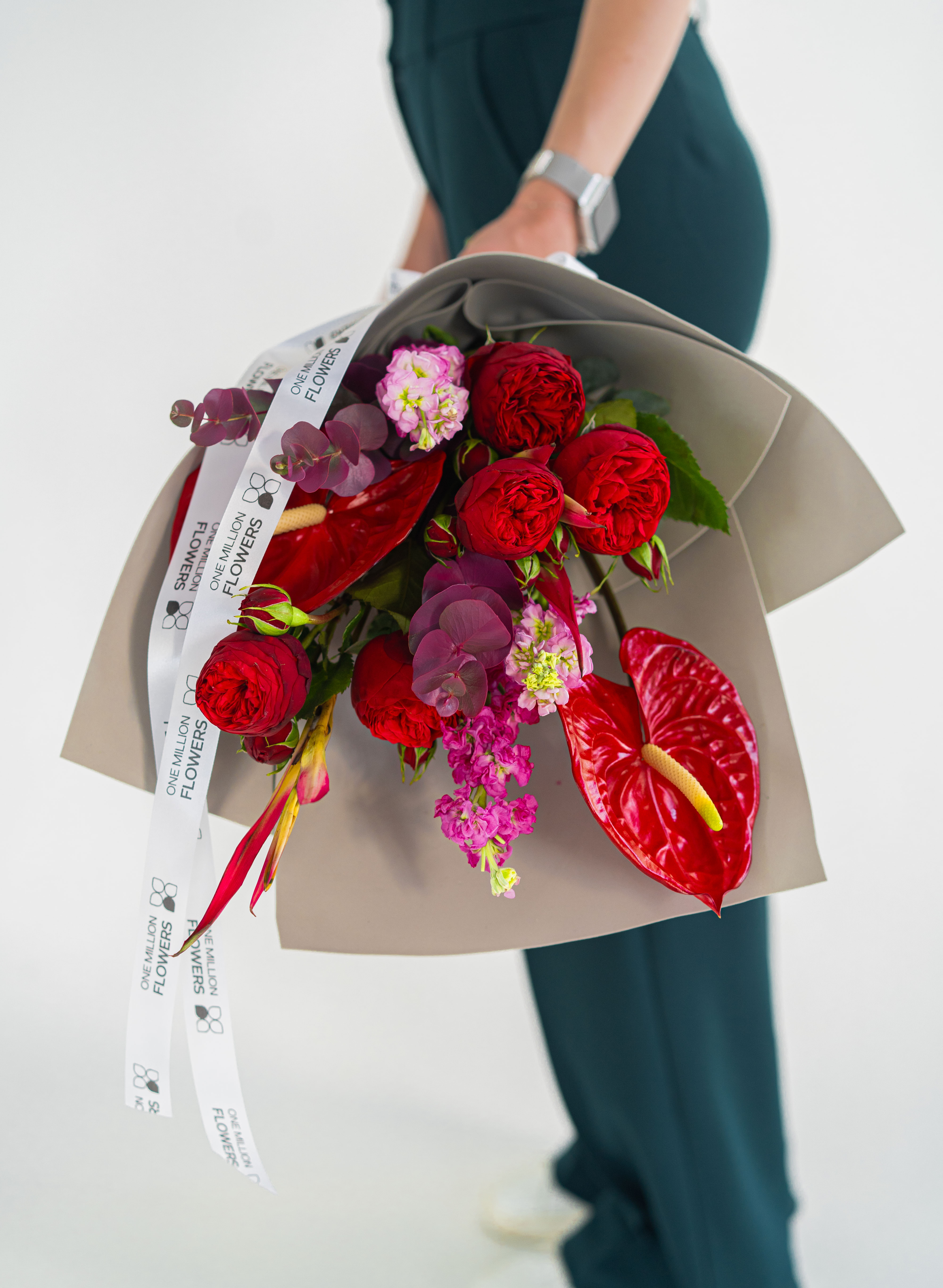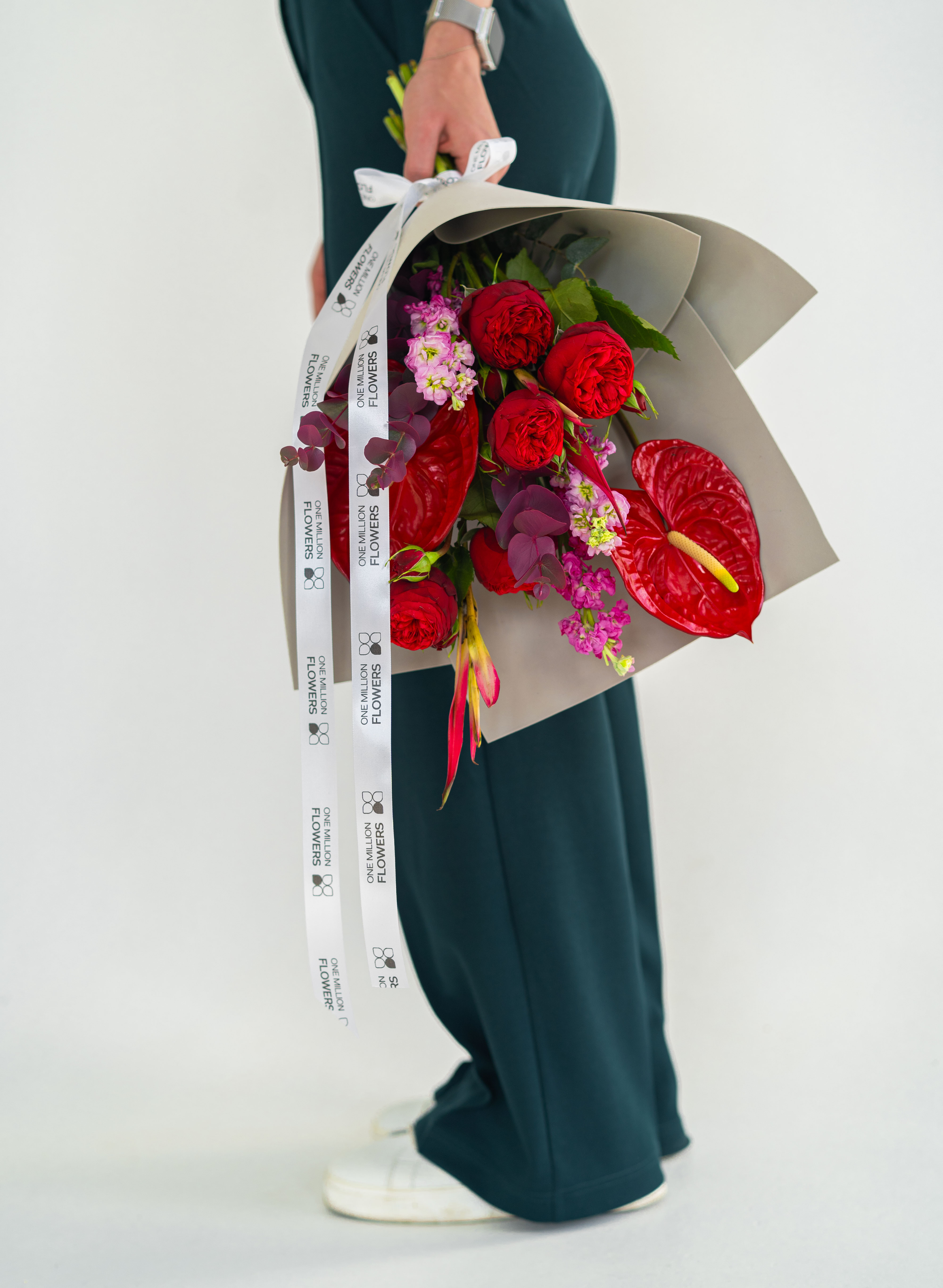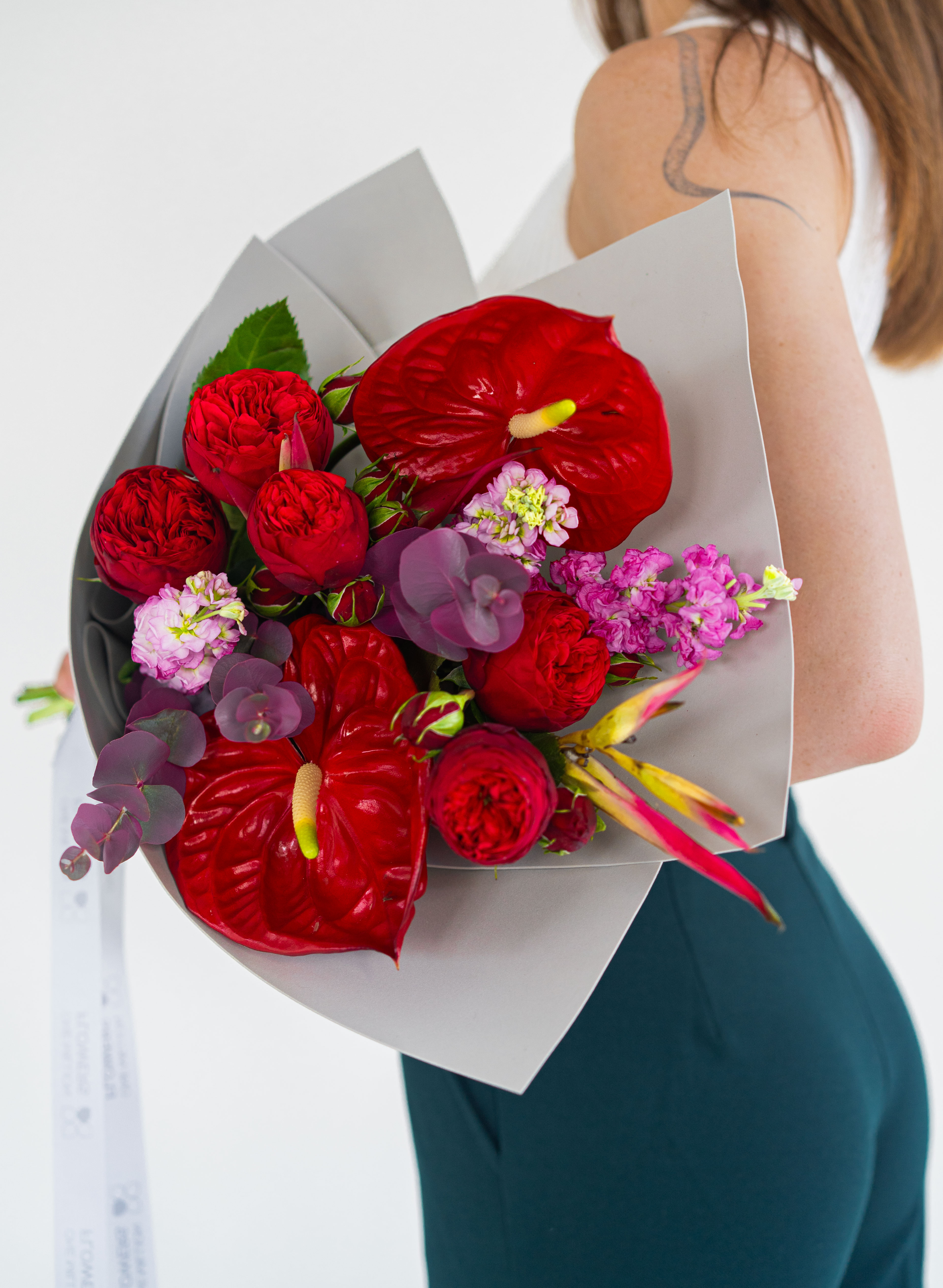 Яркий и стильный букет "Пиано Х Тразин" — это гармония элегантности и выразительности. Роскошные пионовидные розы "Ред Пиано" насыщенного красного оттенка создают эффектную основу композиции. Экзотический антуриум и динамичная стрелиция придают букету смелость и оригинальность, а воздушная розовая маттиола добавляет мягкости и легкости. Завершающий штрих — свежий эвкалипт, который придает композиции особую природную изысканность. Такой премиальный букет цветов станет незабываемым подарком для особенного случая.