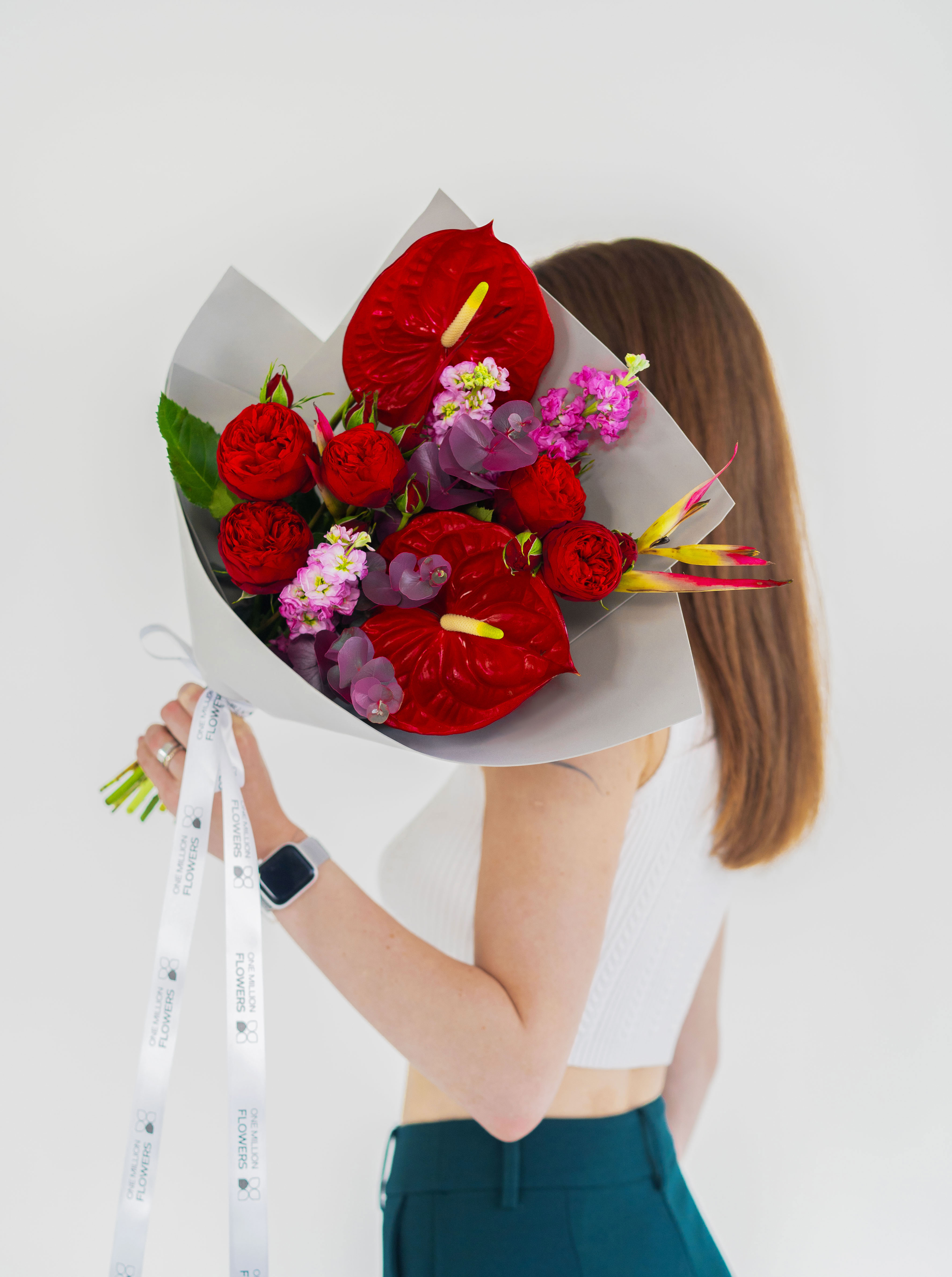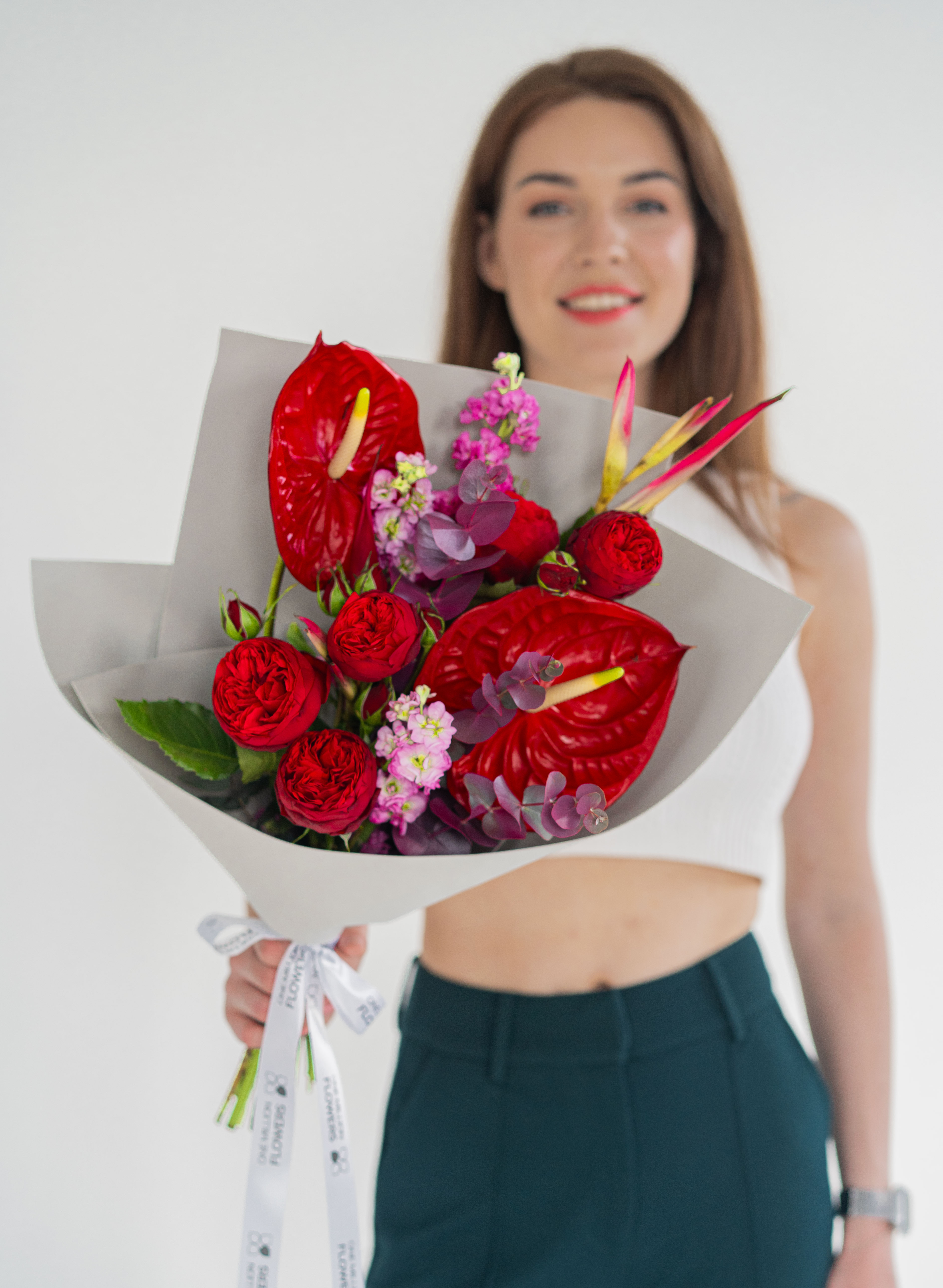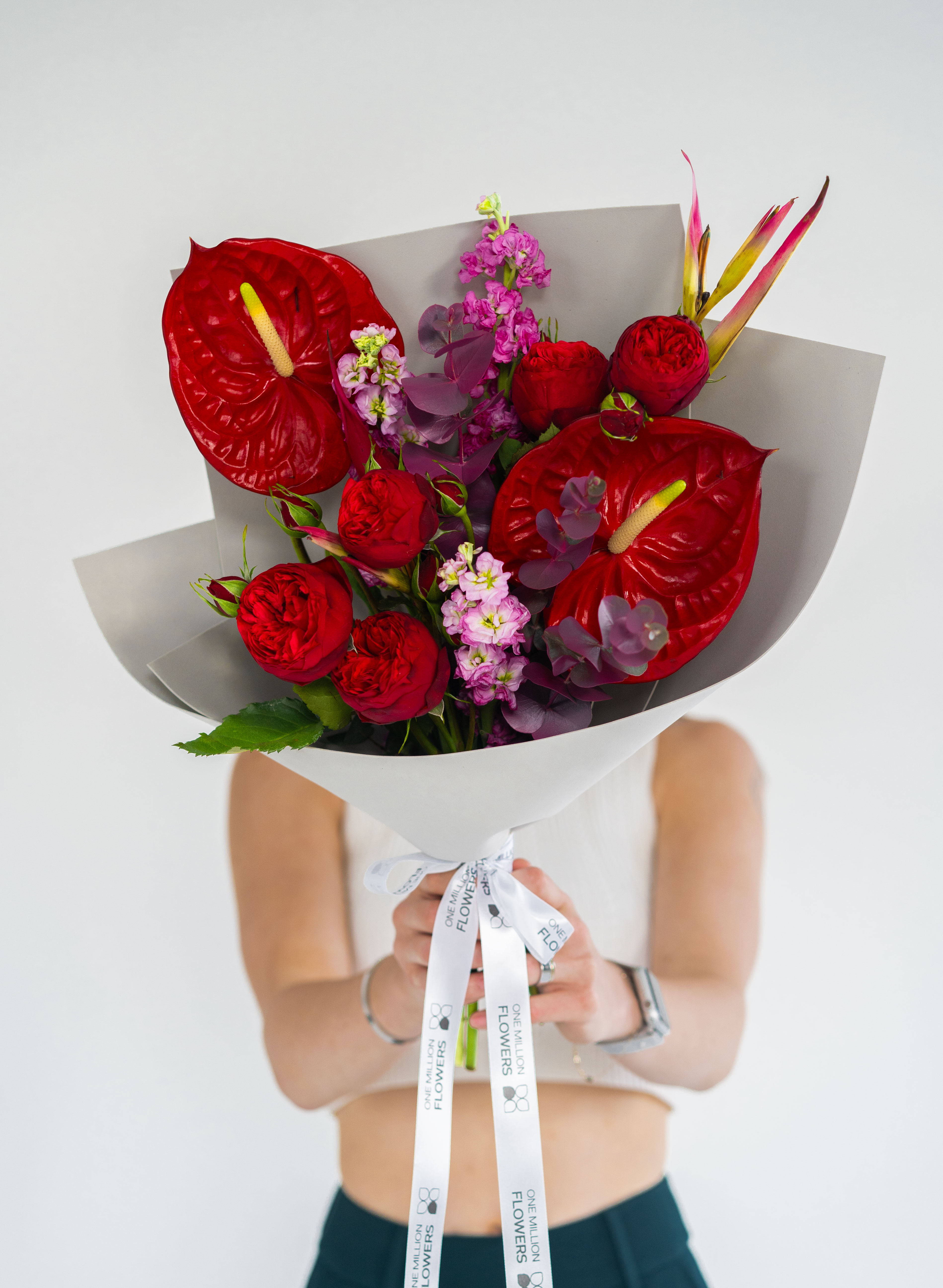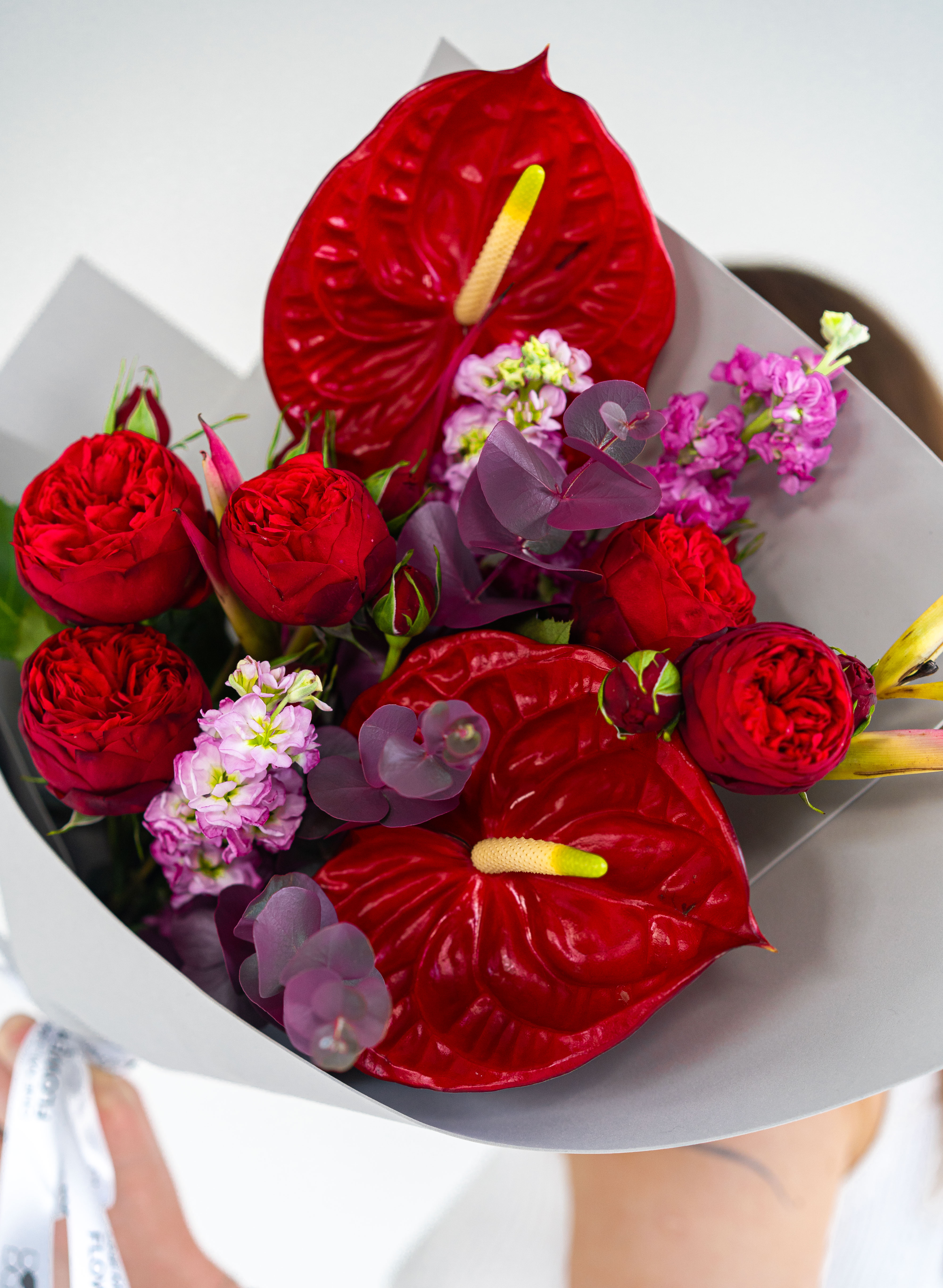 Яркий и стильный букет "Пиано Х Тразин" — это гармония элегантности и выразительности. Роскошные пионовидные розы "Ред Пиано" насыщенного красного оттенка создают эффектную основу композиции. Экзотический антуриум и динамичная стрелиция придают букету смелость и оригинальность, а воздушная розовая маттиола добавляет мягкости и легкости. Завершающий штрих — свежий эвкалипт, который придает композиции особую природную изысканность. Такой премиальный букет цветов станет незабываемым подарком для особенного случая.