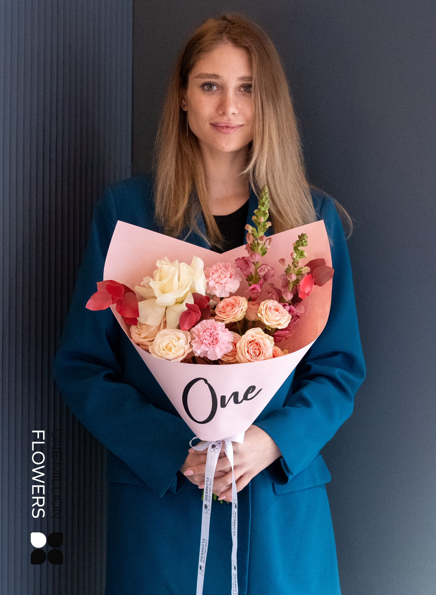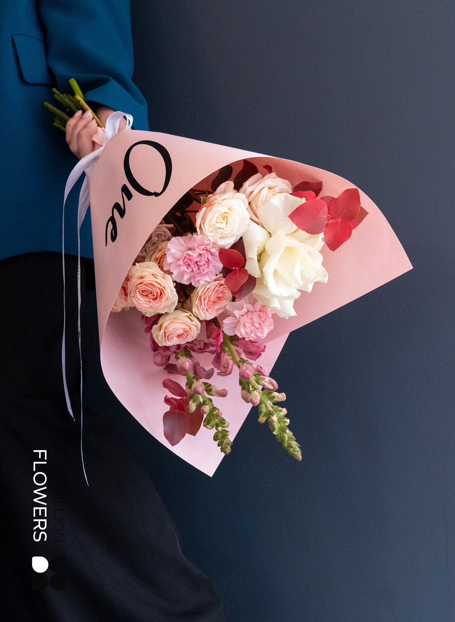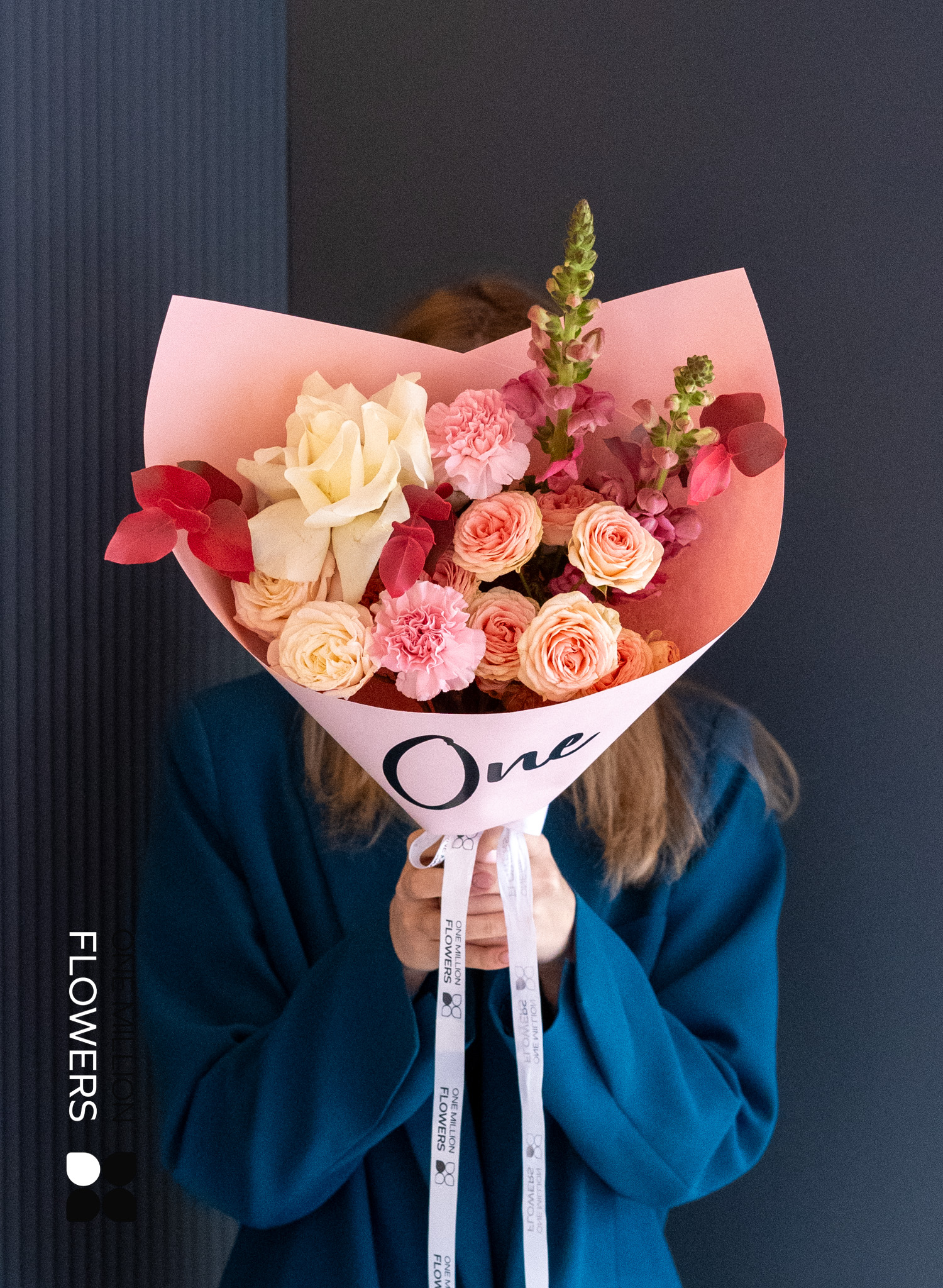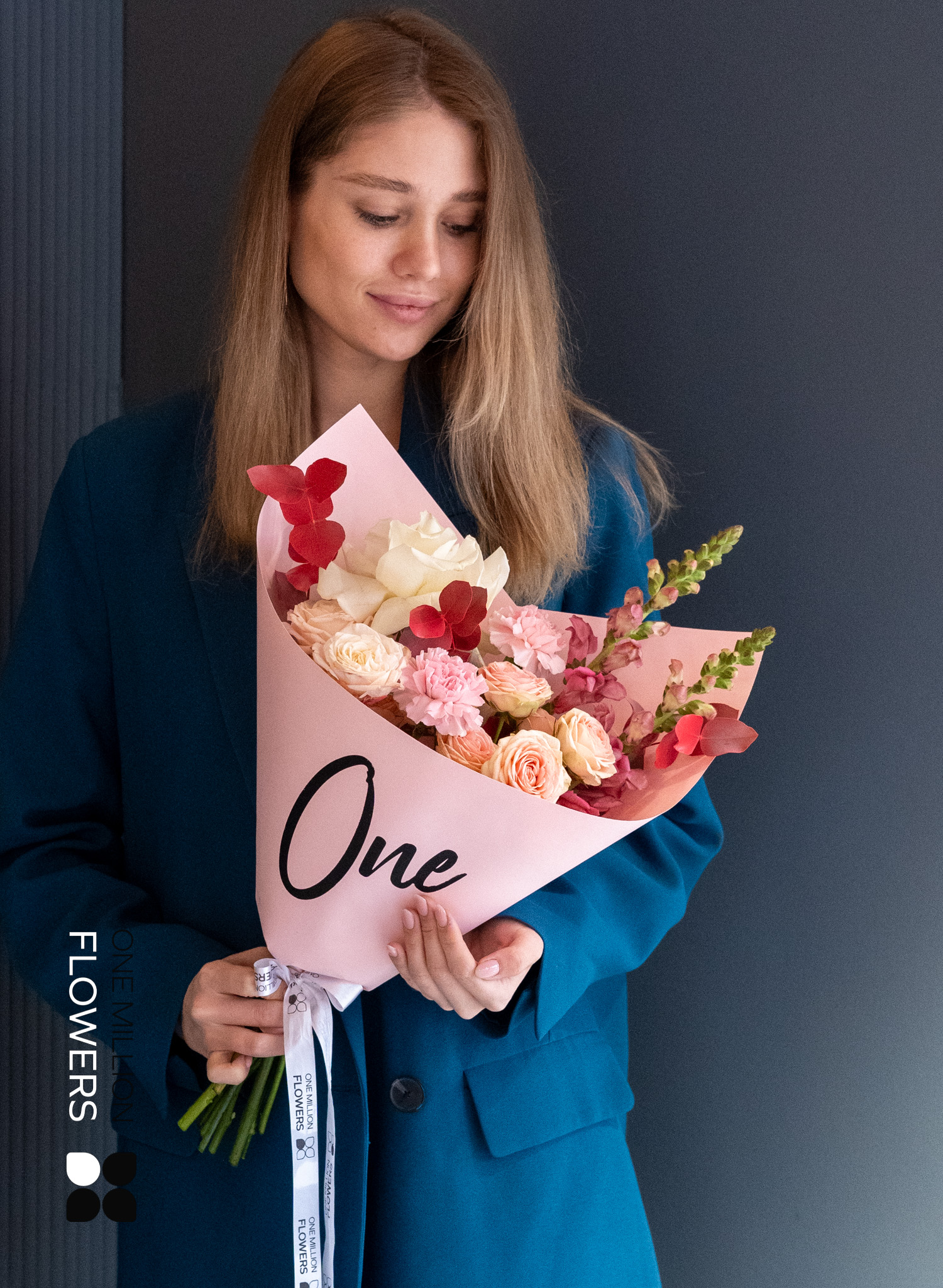 В букете «Пинки Лайт» собраны лучшие оттенки утренней нежности: розовые кустовые розы, эустомы, альстромерии, воздушная маттиола и сезонная зелень. Каждый цветок подобран вручную, чтобы создать мягкое, но выразительное настроение — как первое признание в любви или заботливое «просто так». Композиция оформлена в фирменную обёртку One Million Flowers, подчёркивающую её лёгкость и стиль. Это букет, который не перегружает, а говорит ровно то, что нужно.
