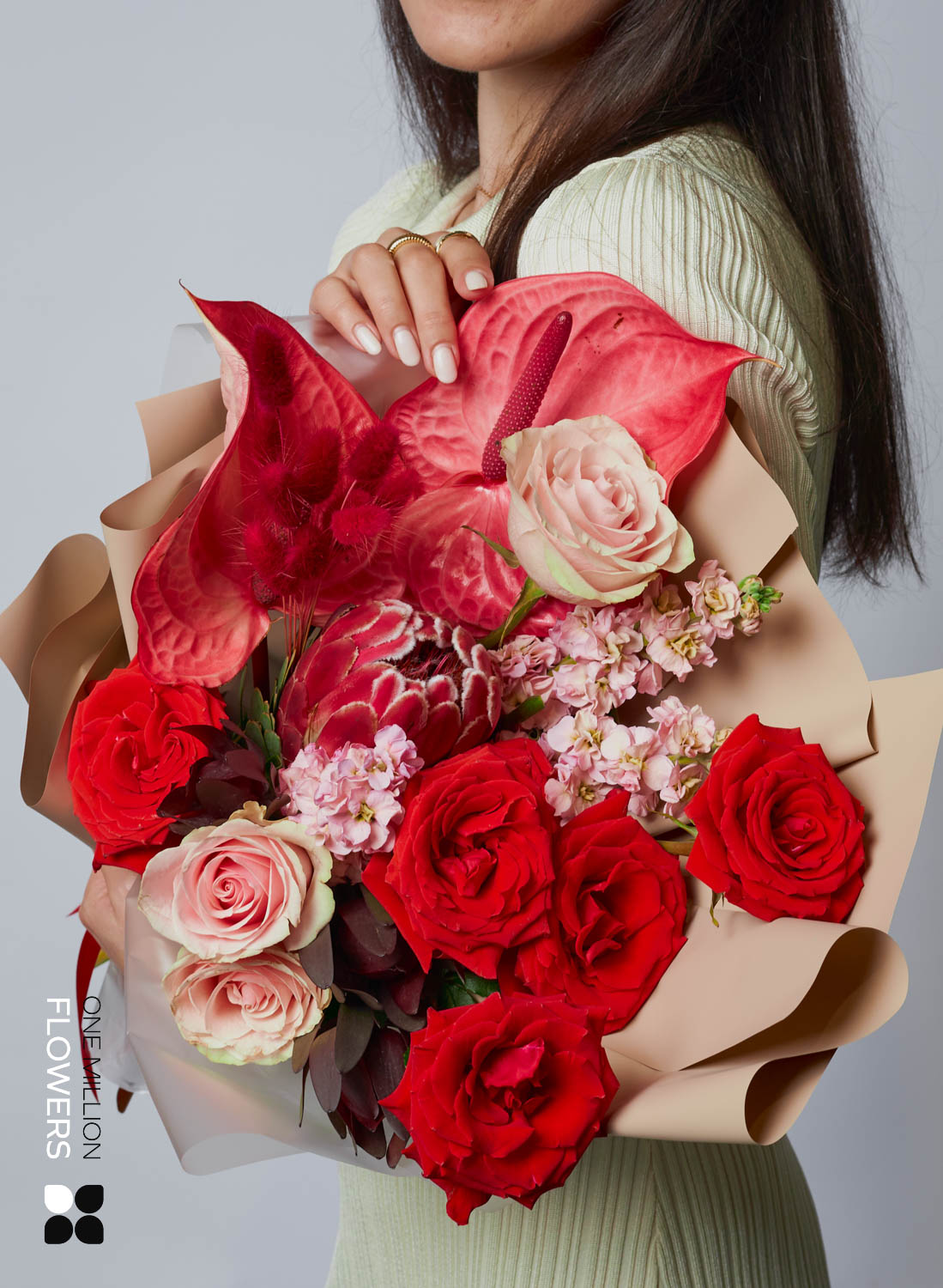 Букет "Ред Раннер" Cream — это не просто композиция, это настоящая цветочная симфония, созданная с любовью и вниманием. Этот букет состоит из различных растений, каждый из которых привносит свою уникальную ноту в общую гармонию. Маттиола розовая и роза Красная 50 в сочетании создают теплую атмосферу, а антуриум и протея добавляют яркие акценты, способные вызвать восхищение.