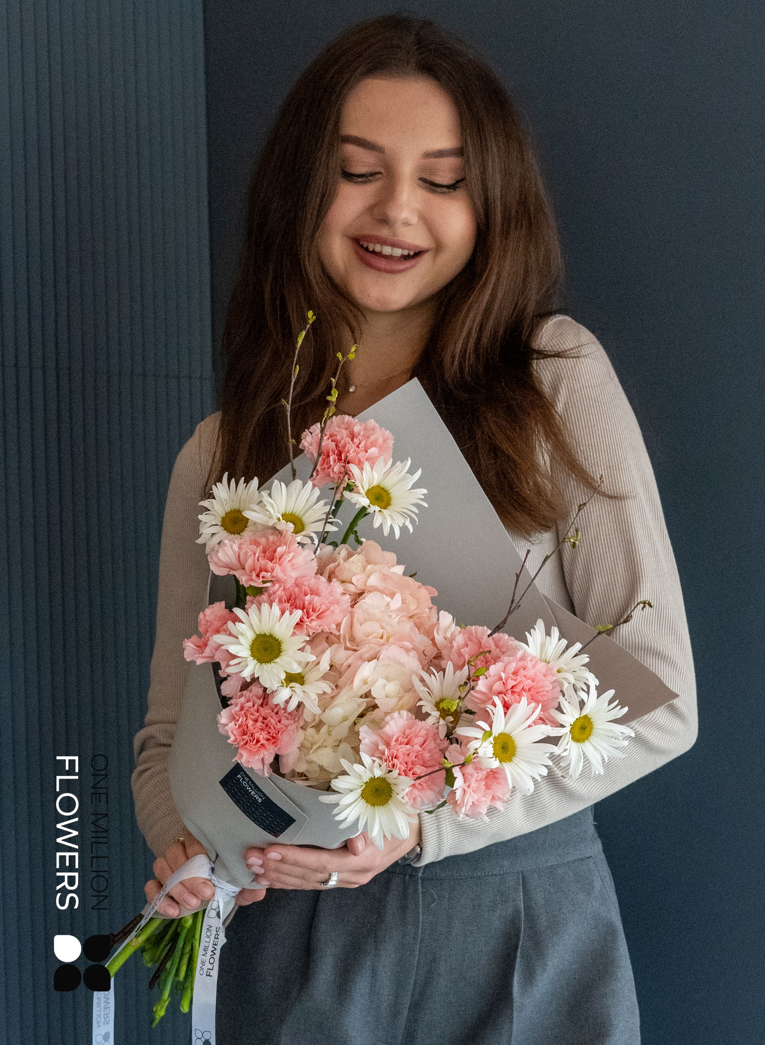 Букет "Самана Пинк" включает тщательно подобранные компоненты: две ветки берёзы, одну розовую гортензию, девять розовых диантусов (гвоздик) и десять ромашек. Такое сочетание создает не только красивую, но и выразительную композицию, в которой каждый цветок играет свою роль, дополняя и обогащая общую гармонию букета.