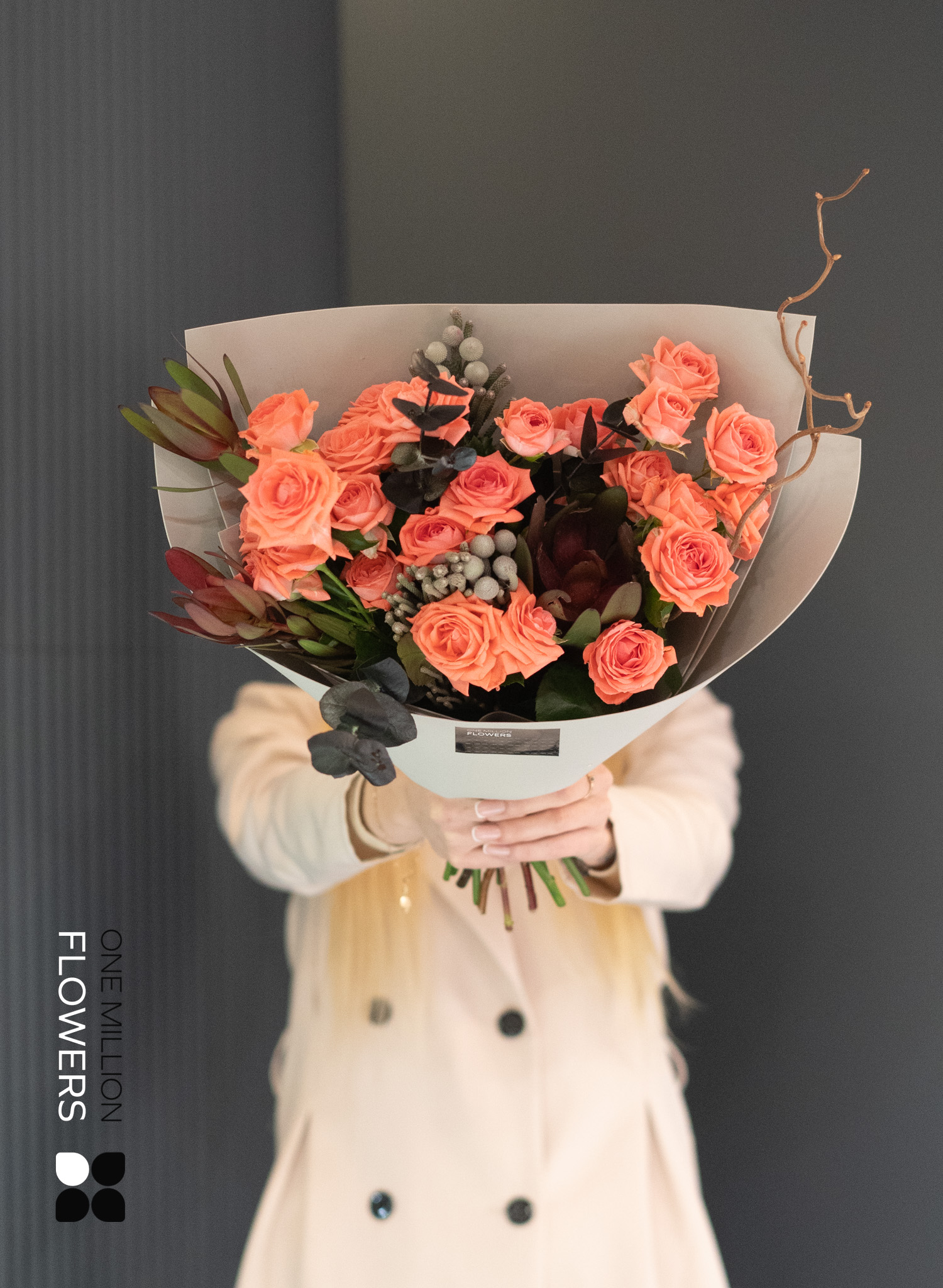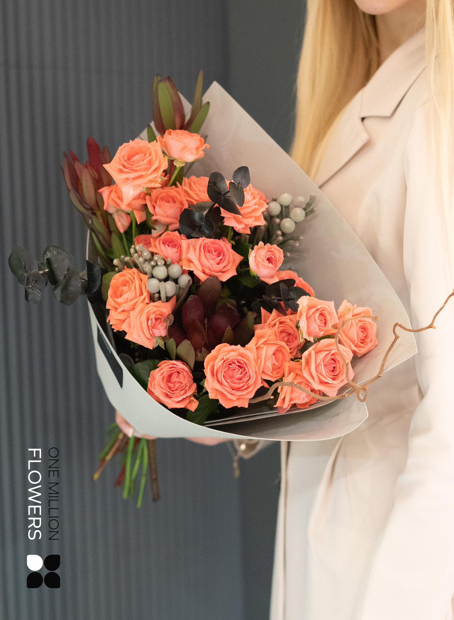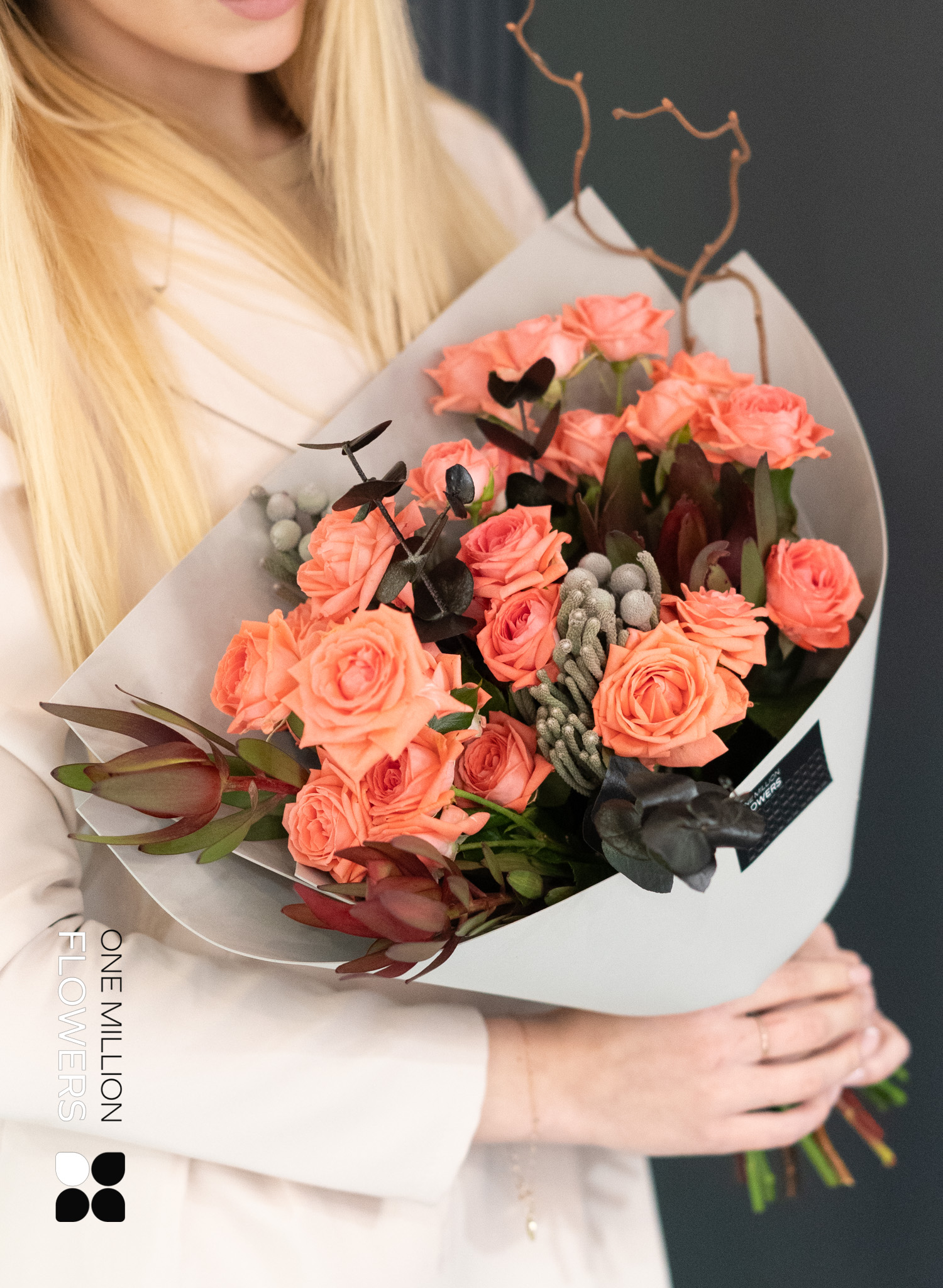 Букет "Сансет Лейн" Gray — это истинное произведение искусства, созданное для ценителей цветов. В его составе собраны яркие и нестандартные цветы, которые создают неповторимый ансамбль. Корилиус в количестве двух штук добавляет композиции объём и текстуру, а пять стеблей леукодендрона переносят вас в мир загадочной экзотики. Эвкалипт, добавленный в букет, придаёт свежесть и легкость, а пять кустовых роз Одилия в нежном розовом цвете делают эту композицию по-настоящему романтичной. Завершает этот цветочный шедевр бруния — два её экземпляра создают интересные акценты.