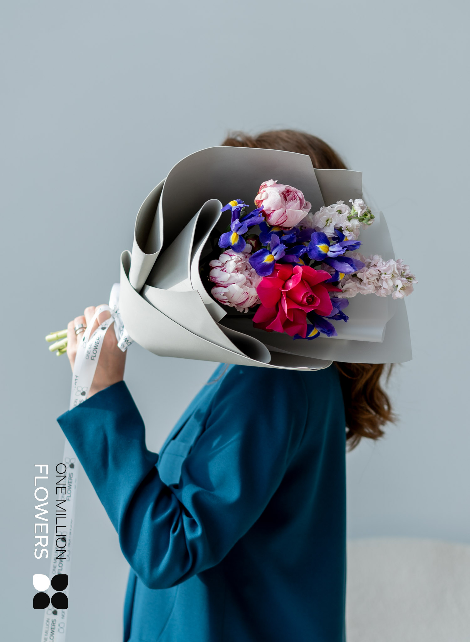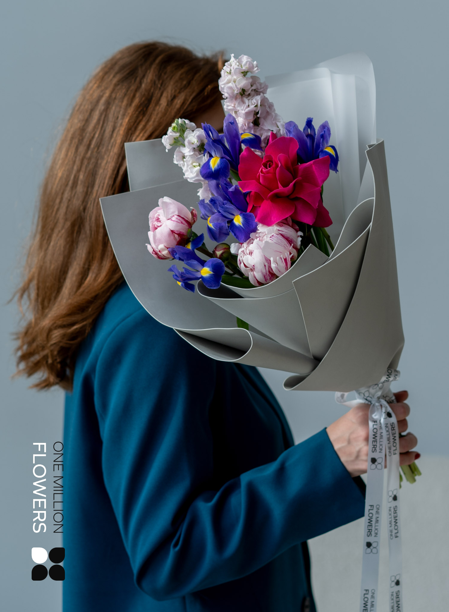 Этот великолепный букет "Сара Х Блю" станет настоящим украшением любого праздника. В его составе — три розовые маттиолы, символизирующие нежность и искренность чувств. К ним добавлены две эквадорские розы сорта Пинк Флойд, которые поражают своей легкостью и утонченностью. Завершает композицию три пионовидных цветка, придающих букету роскошный вид. Не забыли о выразительных синих ирисах — их семь штрихов, создающих яркое настроение и контраст с нежными пигментами других цветов.
