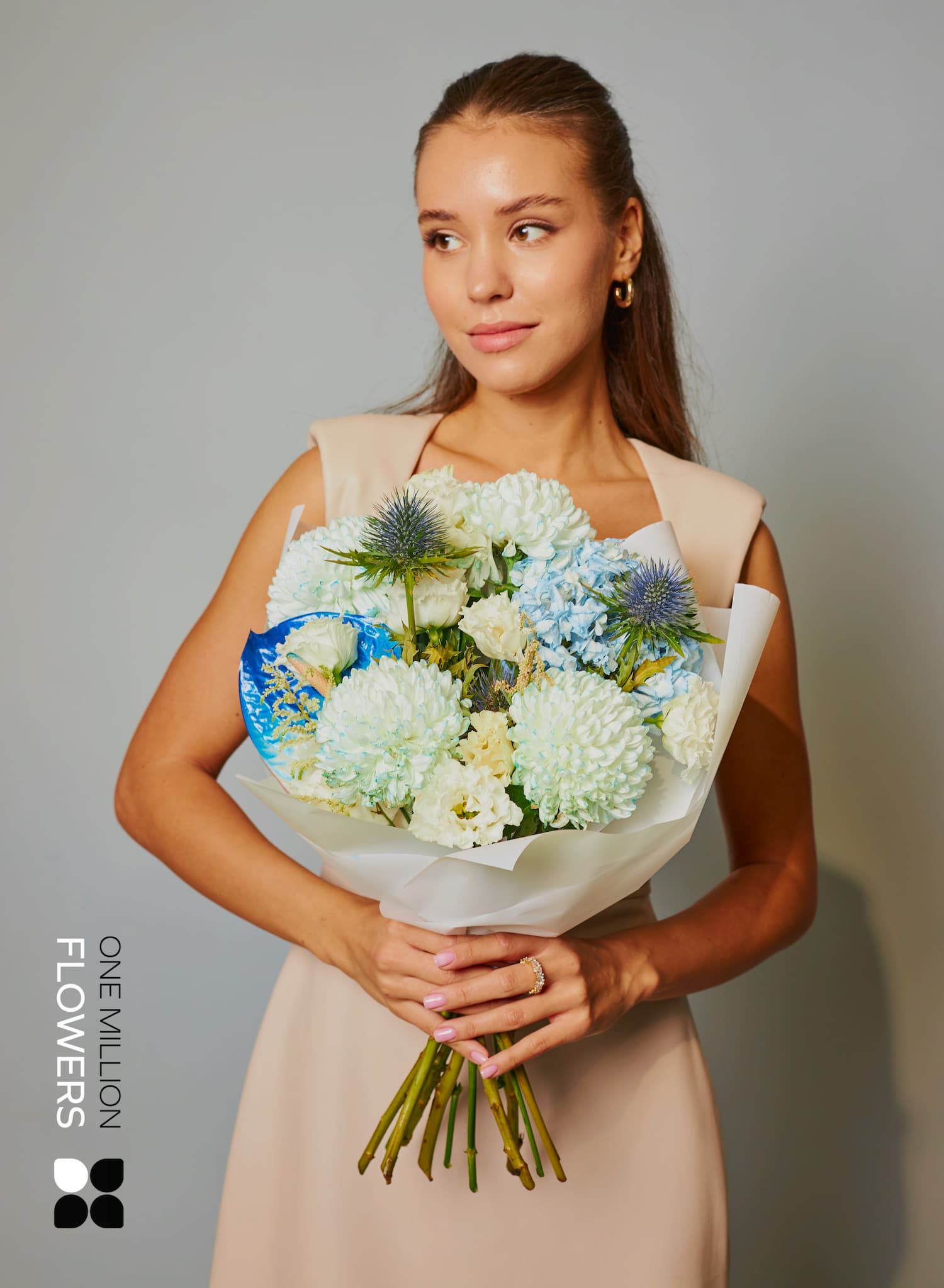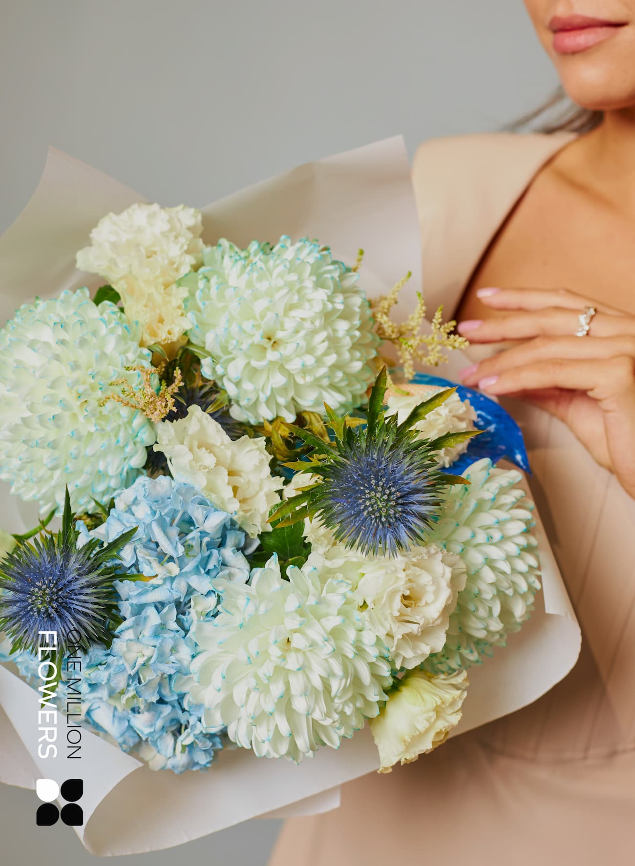 Не менее важные участники композиции — гортензия голубого цвета, один антуриум и два эрингиума. Гортензия вносит в букет нотку яркости и неожиданности, а антуриум, символизирующий страсть и тепло, добавляет особый шарм. Эрингиум, с его утонченной текстурой и цветом, завершает образ букета, создав гармоничное сочетание элементов.