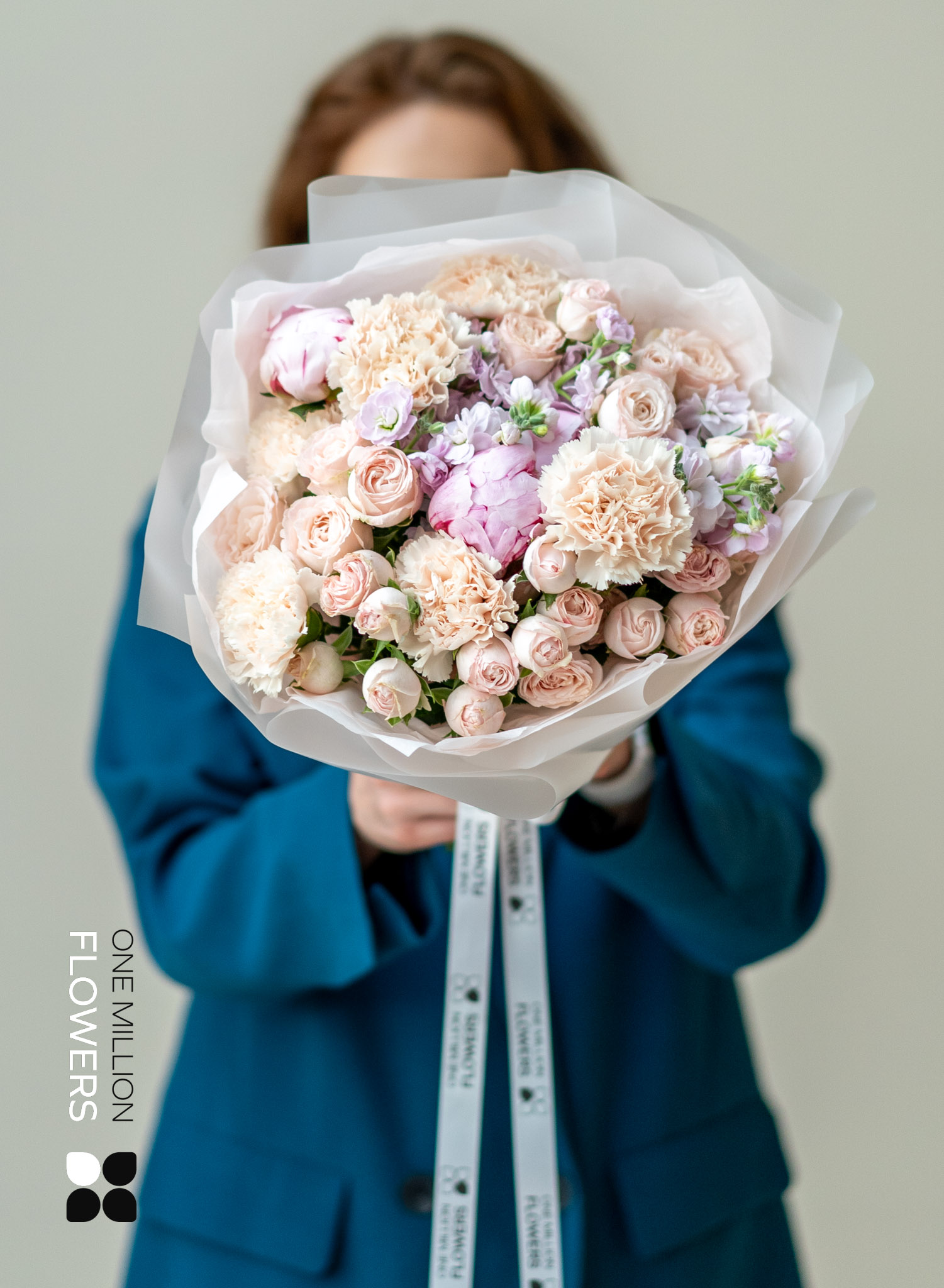 Букет "Свит Арно" White — это восхитительная композиция, созданная для самых требовательных ценителей. Его основа состоит из двух розовых маттиол, символизирующих нежность и романтику. Пять кремовых диантусов добавляют изысканности, а три розовых пиона дарят сладкий, восхитительный аромат, создавая атмосферу уюта и тепла. Завершает этот великолепный ансамбль семь кустовых роз Бомбастик кремового оттенка, которые придают букету особую выразительность и благородство.