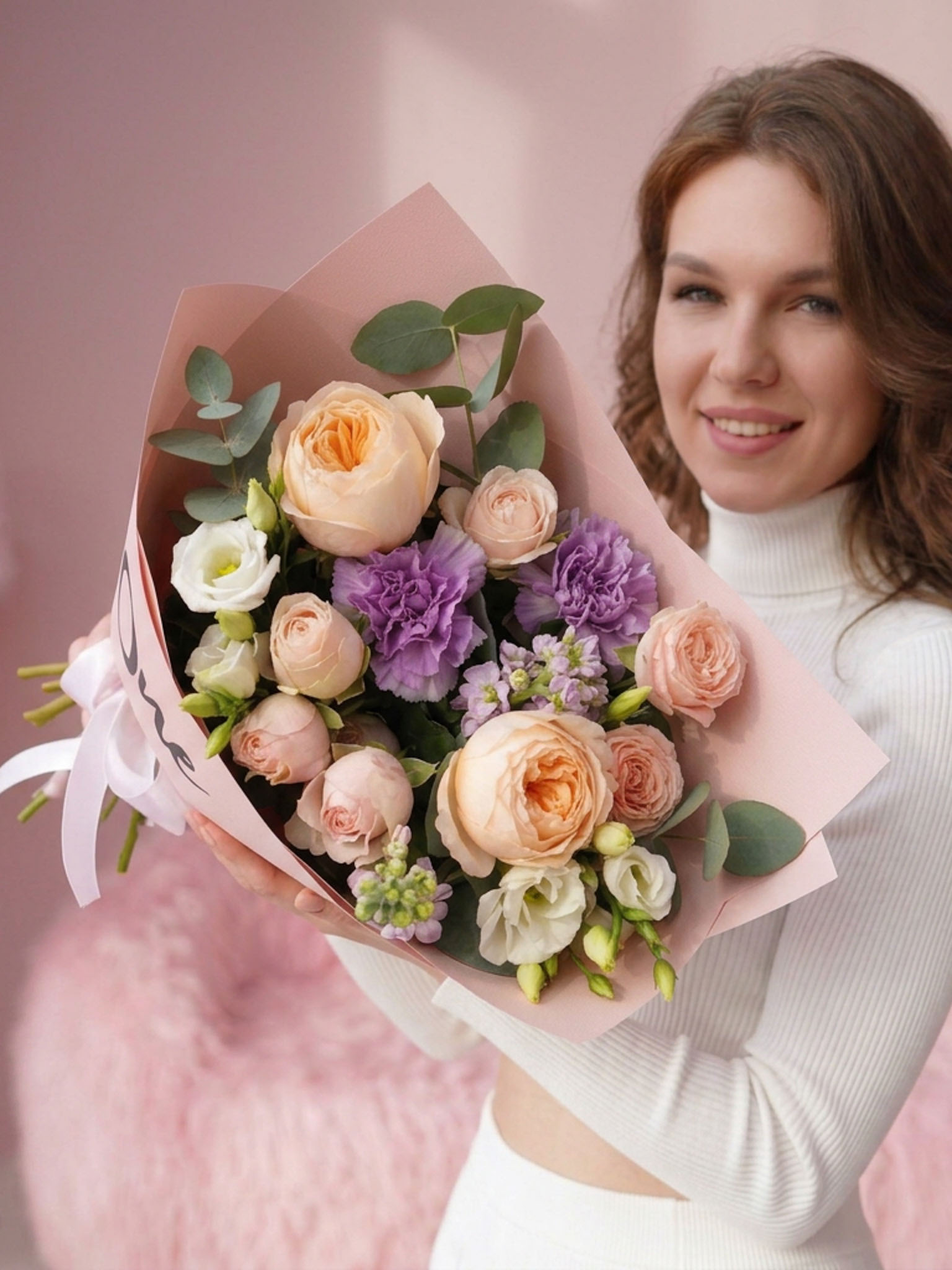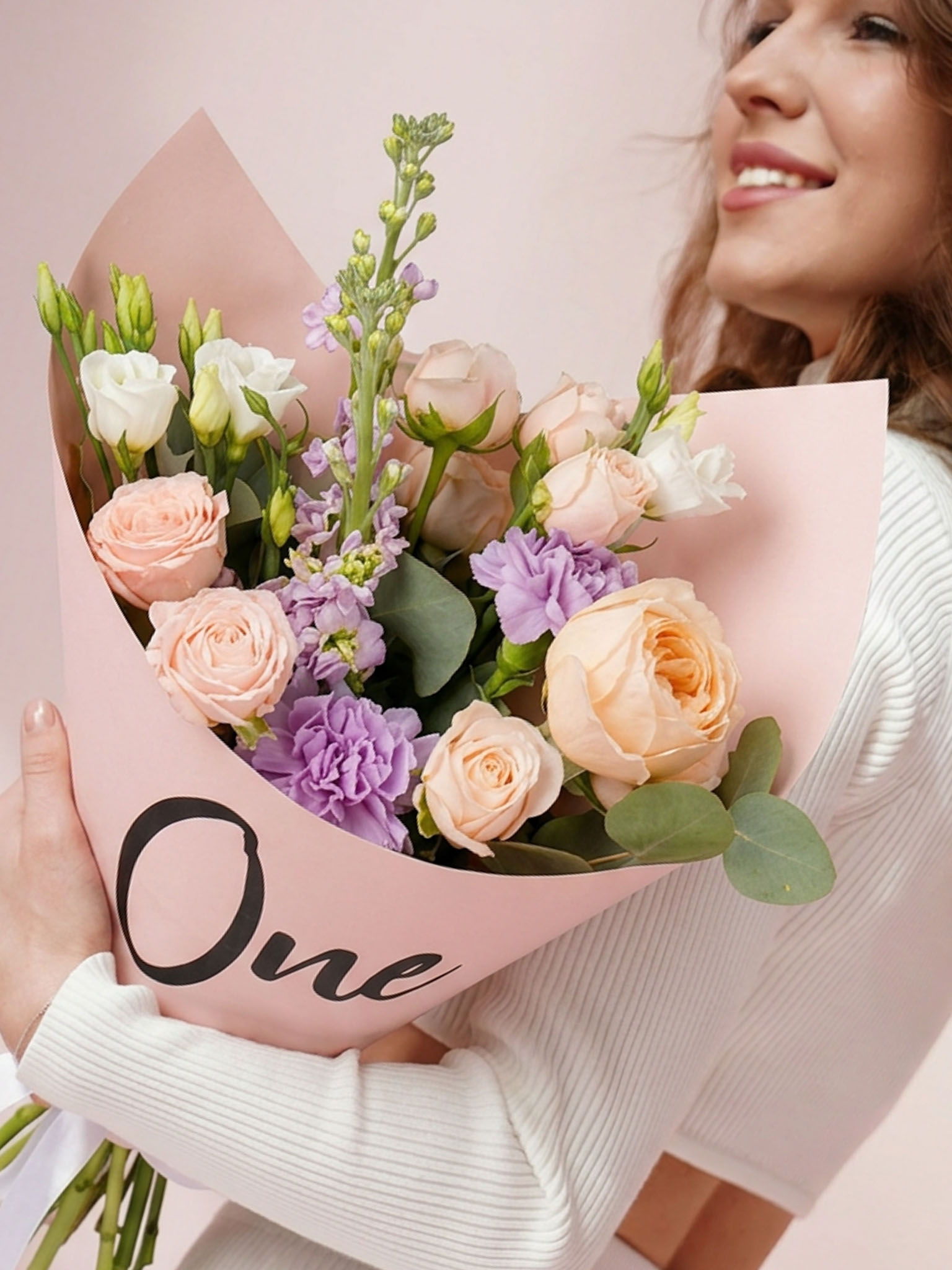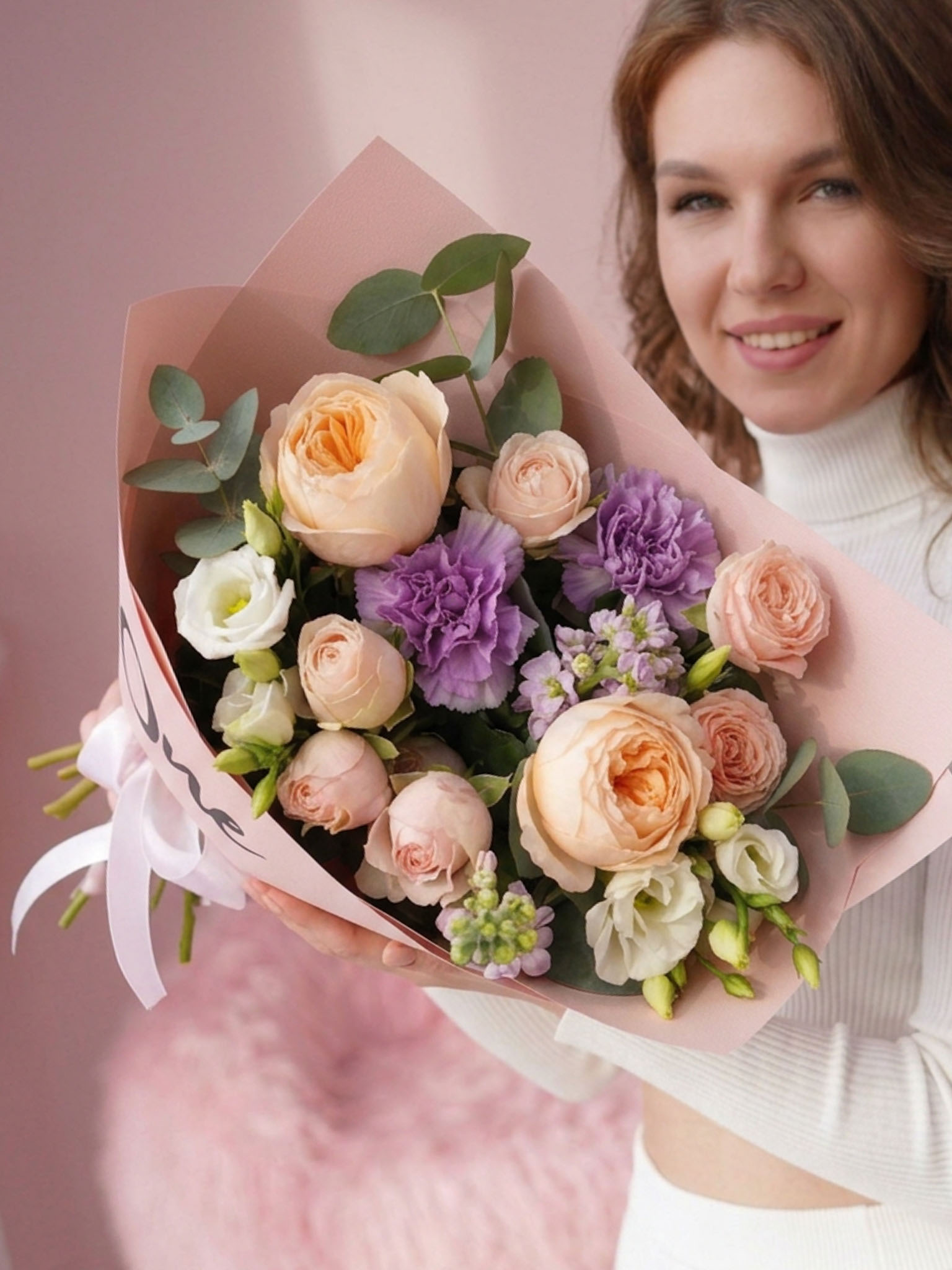 Букет "Уно Ремо" наполнен великолепием и изяществом. В его состав входят 1 пионовидная роза Девид Остин Джульетта, 2 маттиолы сиреневого цвета, 3 кустовые розы Бомбастик Кремовый (нежно), 2 эвкалипта и 2 эустомы белого цвета. Эти цветы не просто создают гармоничную палитру, но и обладают своим символизмом: пионы олицетворяют счастье и новый старт, в то время как маттиолы являются символом любви и верности. Нежные цветовые сочетания и богатый аромат создают атмосферу, которая наполнит любое пространство теплом и радостью. Порой, погружаясь в эту цветочную симфонию, невольно представляется уютный вечер, когда любимый человек неожиданно проявляет чувства, даря такой волшебный букет.
