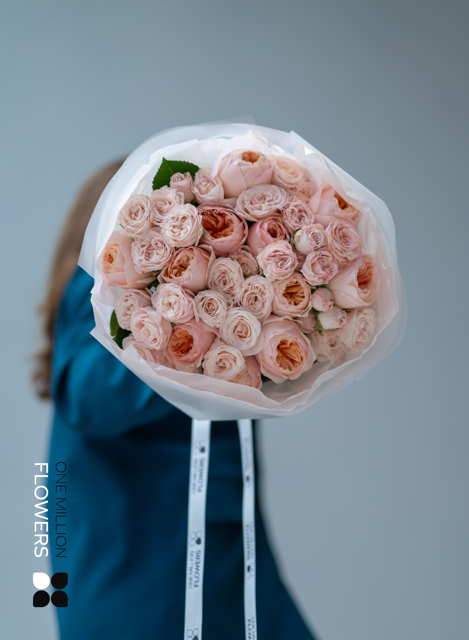 Букет Duo "Бомбастик Х Джульетта" — это не просто композиция, а настоящее художественное произведение. Он включает в себя 11 штук пионовидной розы сорта Девид Остин Джульетта и 10 штук кустовой розы Бомбастик Кремовый. Пионовидные розы завораживают своей нежной текстурой и цветом, а кустовые розы дополняют букет своей элегантностью. Этот тандем создает эффектный образ, который подчеркивает красоту момента.