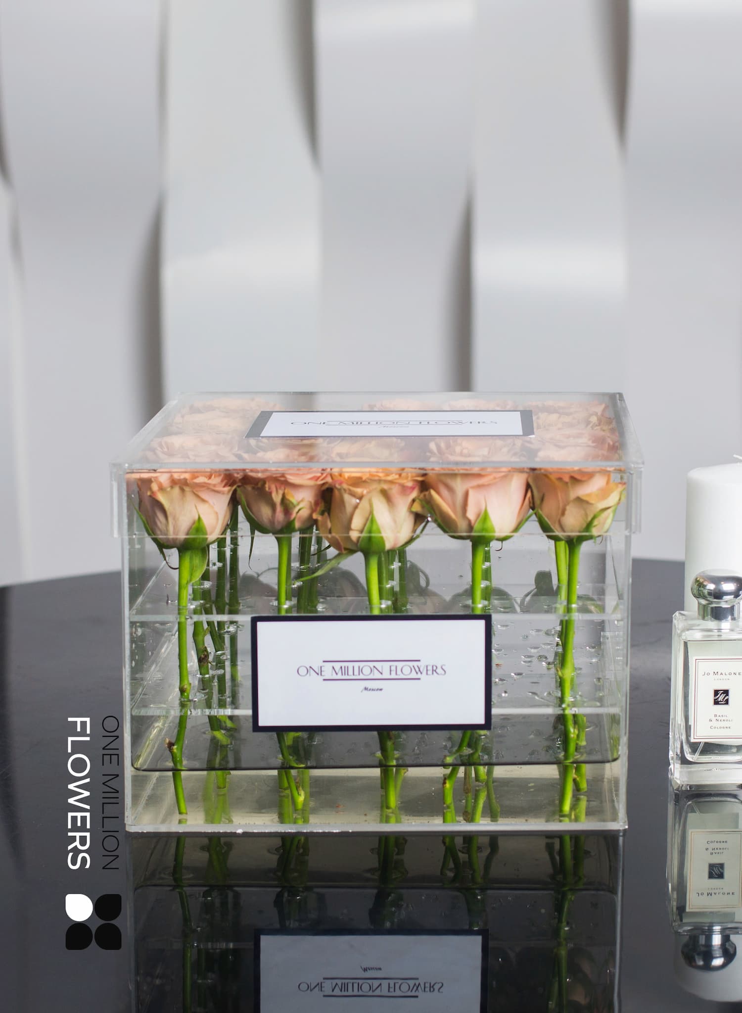 В состав бокса входят 25 шт. роз Капучино, которые радуют своей элегантностью и неповторимым цветом. Стеклянный бокс, в который помещены цветы, не только подчеркивает их красоту, но и служит долговечным оформлением, которое можно использовать повторно. Этот набор идеально подходит как для подарка, так и для личного наслаждения.