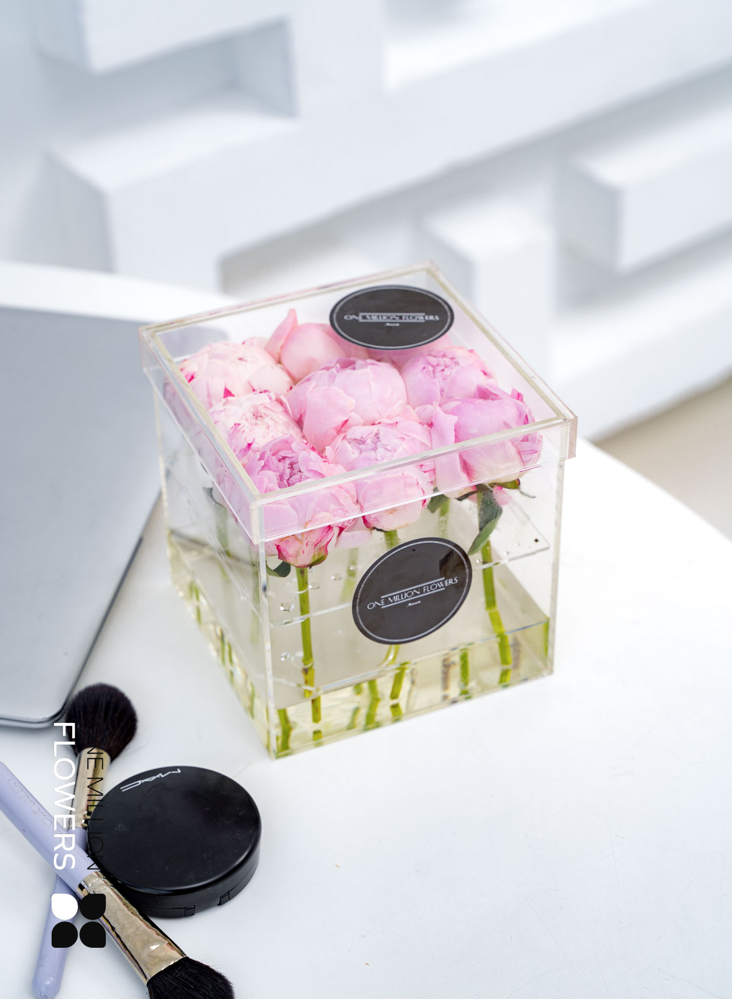 Внутри прозрачной стеклянной коробки — девять пионов сорта "Сара Бернар". Это цветы с выразительными, многослойными бутонами нежного пудрово-розового оттенка. Стеклянная упаковка превращает композицию в арт-объект: видно каждую деталь, каждый лепесток, как в витрине. Такой бокс выглядит современно, минималистично и в то же время — невероятно трогательно.