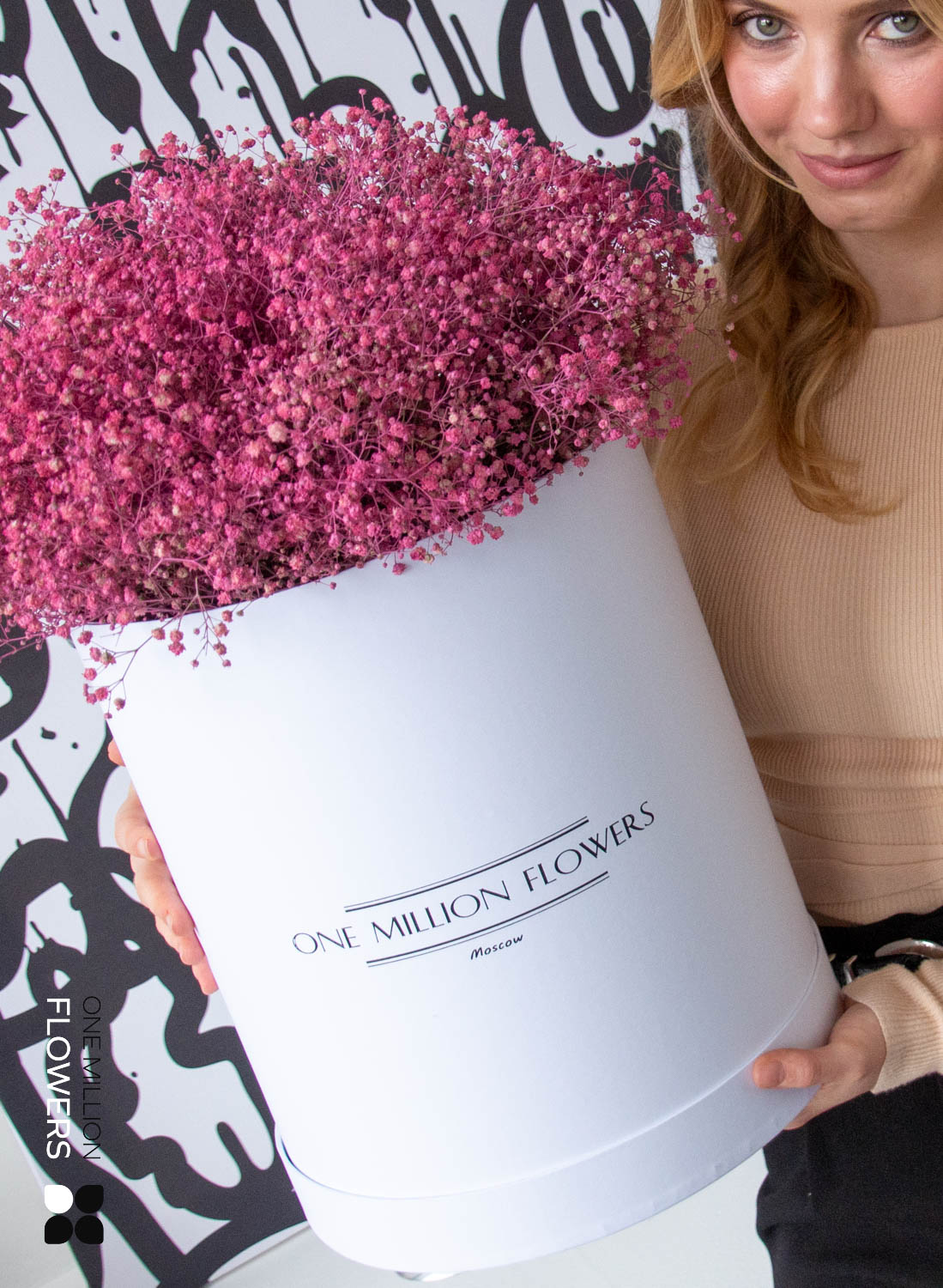 Коробка с гипсофилой — это не просто цветы, а настоящее произведение искусства, которое подойдет для создания романтической атмосферы или как комплимент к любому празднику. Её можно использовать как самостоятельный подарок или дополнение к основному презенту.