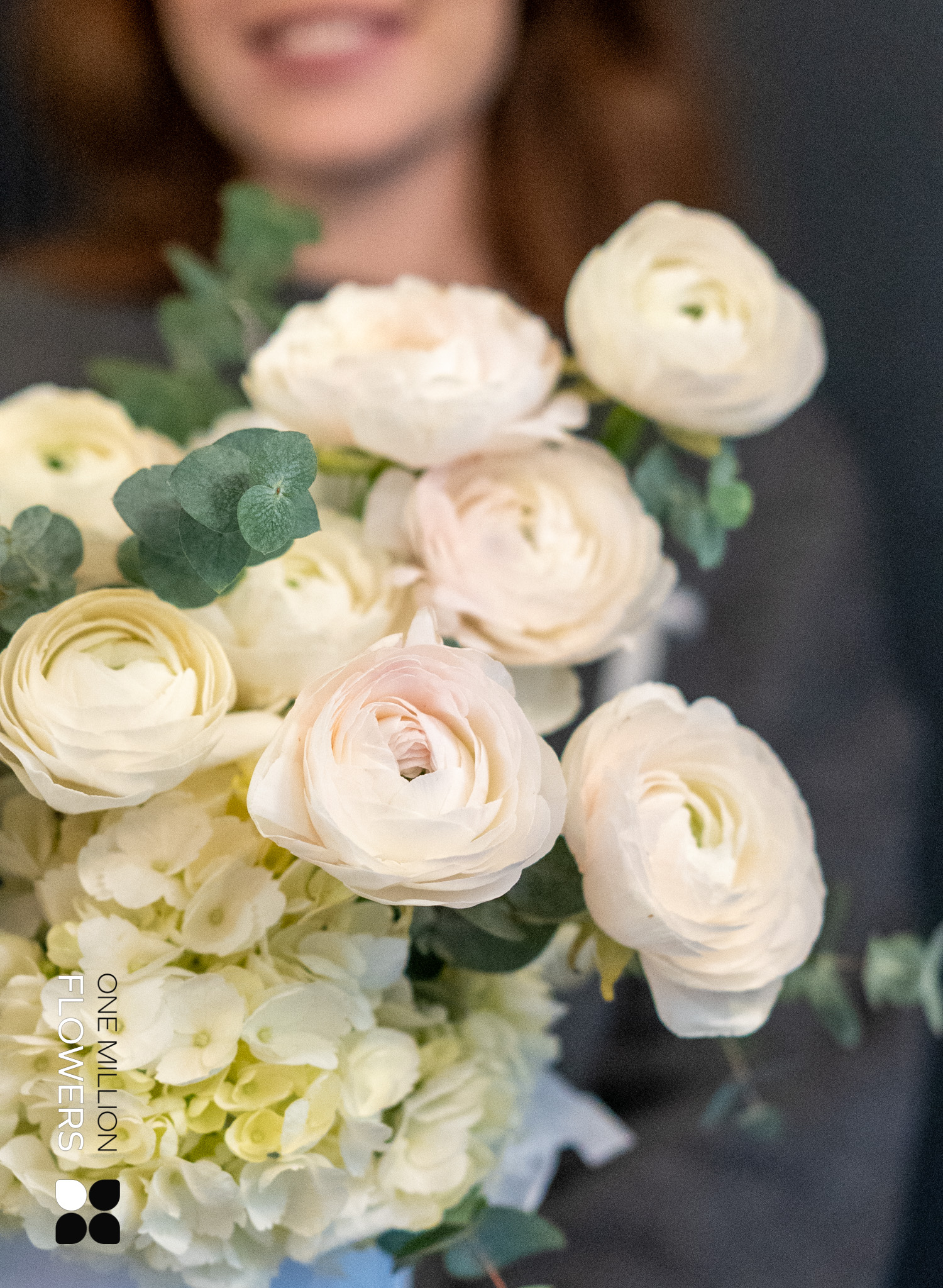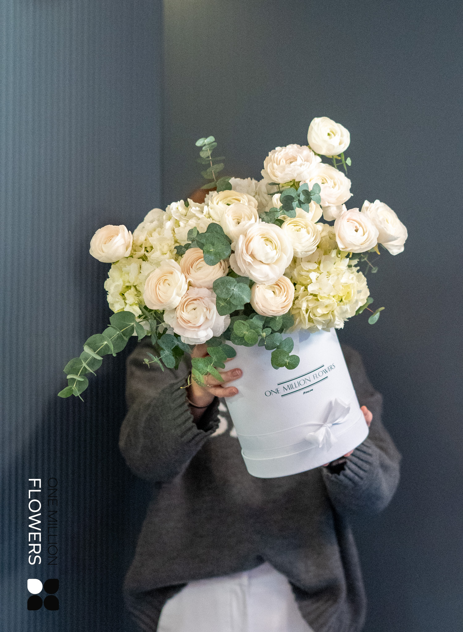 Каждая коробка содержит: 25 кремовых ранункулюсов, великолепные белые гортензии и свежий эвкалипт. Создавая этот букет, мы вложили душу и страсть к флористике, чтобы каждый элемент выделялся своей красотой. Ранункулюсы с их бархатистыми лепестками и гортензии с пышными снежными соцветиями создают атмосферу весеннего пробуждения, а эвкалипт добавляет нотку свежести и утонченности. Это идеальное сочетание цветов, которое позволит вам выразить свои чувства без слов.