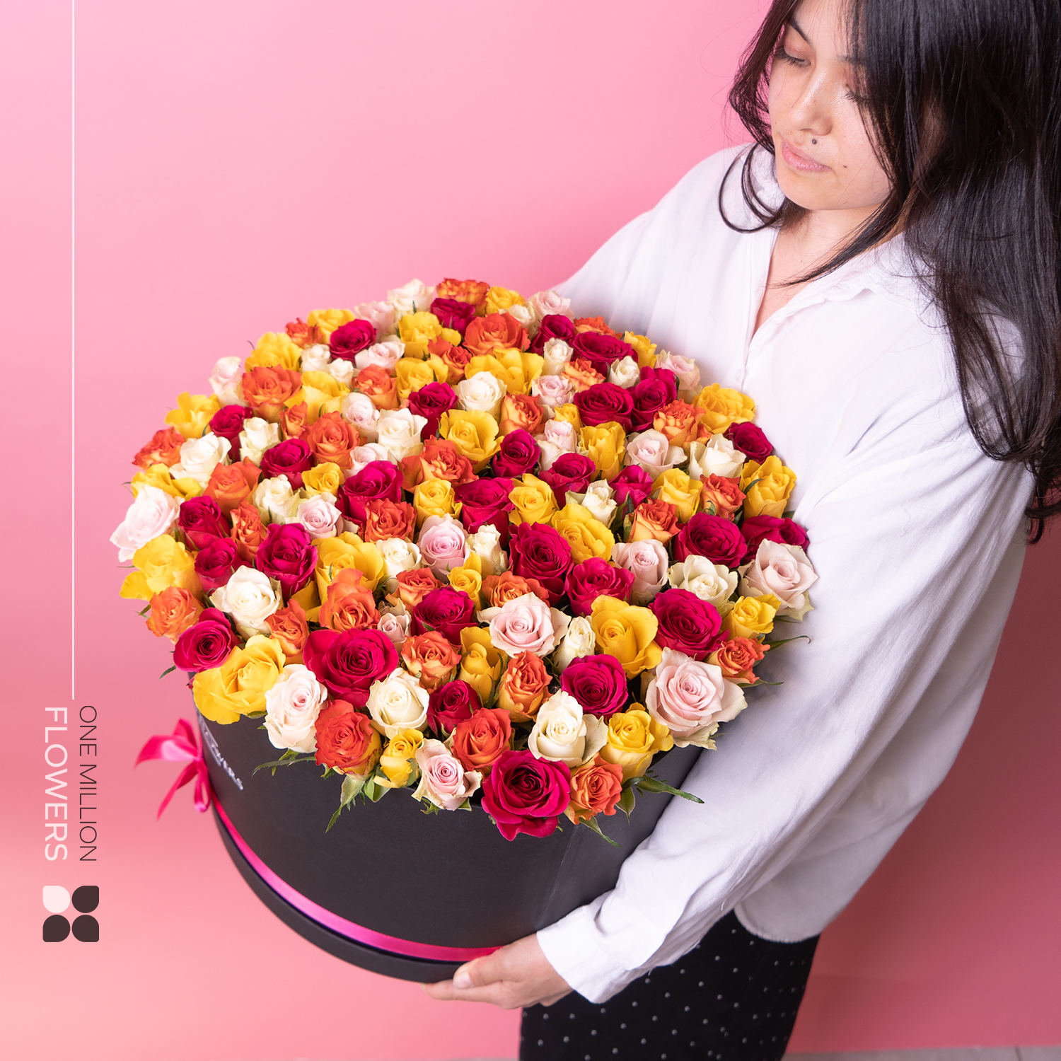 Коробка "Шалимаро Микс" Mega Grand – потрясающая композиция, насыщенная красотой и изысканностью. В ее состав входят 139 нежнейших роз сорта Кения микс, а также одна элегантная черная коробка Мега Гранд.