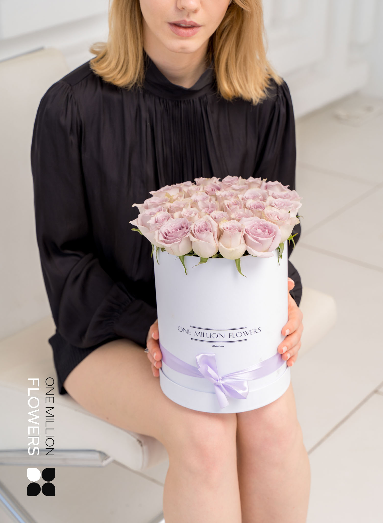 Преимущества Коробки "Ультравайлет" White - Mini очевидны - это необычное исполнение обычной цветочной композиции привносит шикарность и изящество в каждую ситуацию. Букет легко поместится на столике ресторана или уютном камине домашней обстановки.